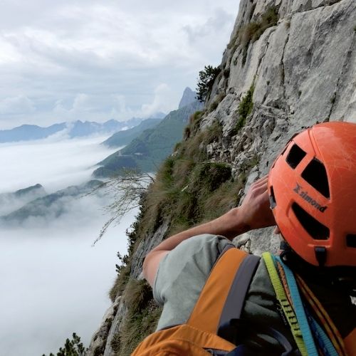 I tiri non sono lunghi, ma già dal primo noto che il tempo di percorrenza è più lungo del solito. Con “solito” mi riferisco allo standard del mio compagno. Dall’alto sento urlare “roccia da buona a ottima”, il che significa il contrario. Ma non va mai persa la speranza, anche questo è allenamento. E non parlo tanto della difficoltà, quanto del saper ascoltare. Ascoltare la roccia, bussare e comprenderne il suono, per capire se è un appoggio stabile o instabile. Oggi la melodia non è così promettente, ma sarà sufficiente trovare le note giuste per proseguire. Come sempre, sarà la parete a dirci se possiamo affidarci a lei o se oggi non è dell’umore giusto.