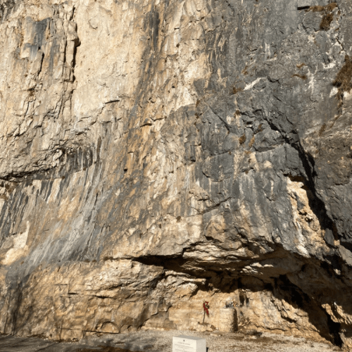 Arrivati sotto la roccia tempestata di spit, ci troviamo di fronte a un enorme e scenografico muro bianco e grigio, dipinto di sfumature e vivacizzato da giochi di luci e ombre.