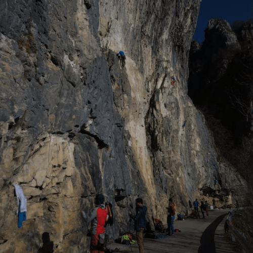 Sono le 11 circa e sotto le pareti la strada si colora con le tinte sgargianti di diversi arrampicatori. Chiediamo a chi qui ci è già stato e ci dicono che i gradi sono corretti, a parte qualche tiro con gradi abbastanza generosi. Quindi proseguiamo il nostro test. Arrampichiamo su altri 6a e tentiamo da secondi una salita sul 6c.