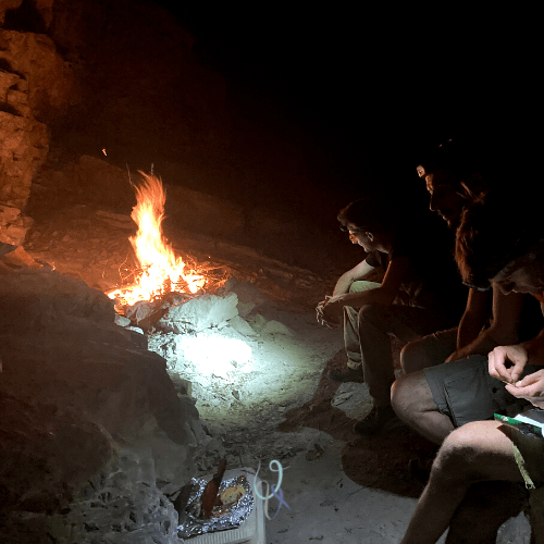 La chicchierata finisce con qualche battuta tra amici, un piccolo fuoco tra le rocce e un panino ripieno di salsiccia, pancetta e verdure cucinate alla brace.