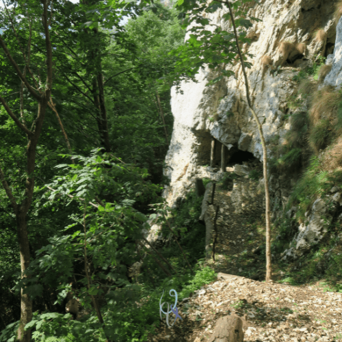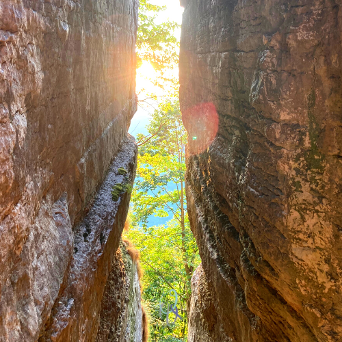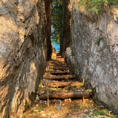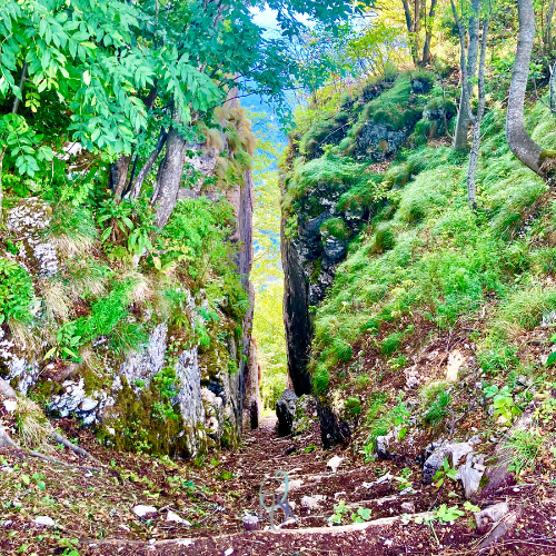 Eh già: tra gli alberi scorgiamo un’entrata naturale che sembra costruita appositamente per incorniciare questa scalinata di terra e legno (complimenti agli autori). La discesa, infatti, si presenta tra due alte pareti di pietra che accompagnano i diversi metri di percorrenza.