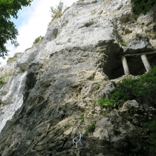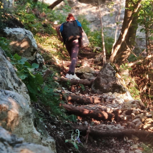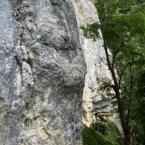Quando arriviamo alle pareti chiodate (alla fine della scalinata svoltiamo a destra) la roccia è illuminata dal sole. Sì, scopriamo che la falesia è esposta a ovest, quindi il sole arriva al pomeriggio. Ma non è certo questo che ci può fermare dopo la storia del nostro tragitto.