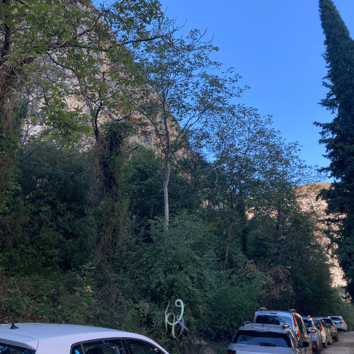 Dal parcheggio accanto al cimitero saliamo lungo un breve sentiero per un minuto fino ad arrivare alle pareti che puntano dritte al cielo proprio sopra le nostre teste.