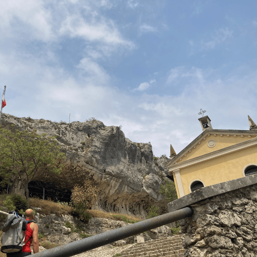 Saliamo la scalinata e dietro il piccolo edificio compare la parete della falesia di San Donato, una piccola palestra di roccia che si fa notare con le sue inclinazioni.