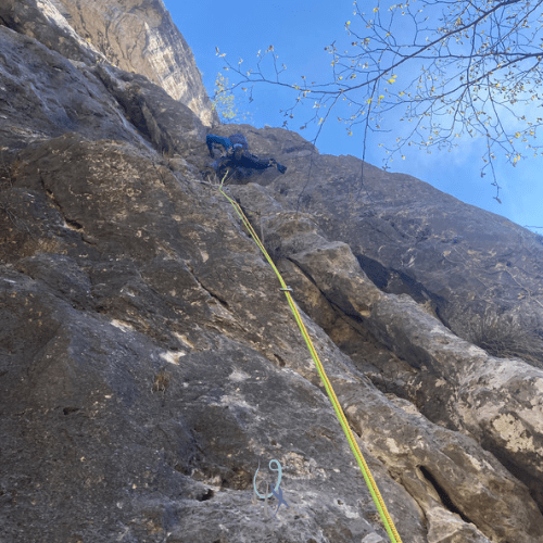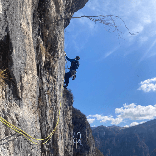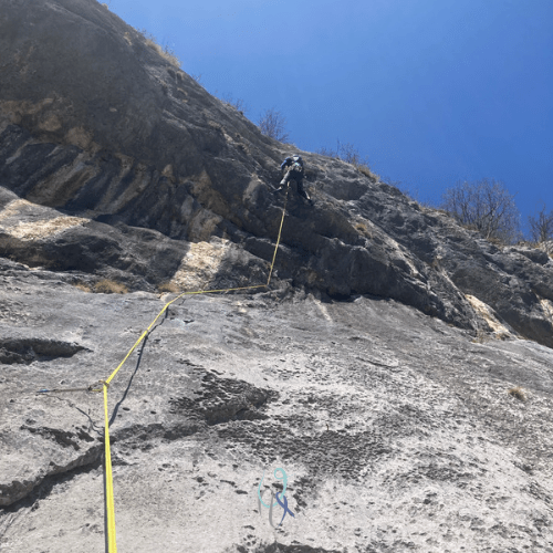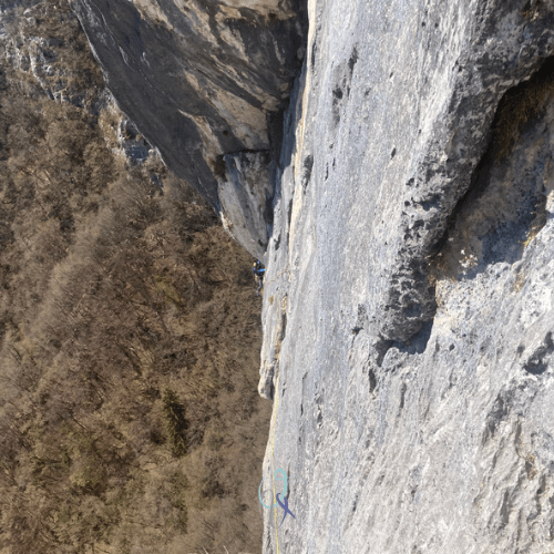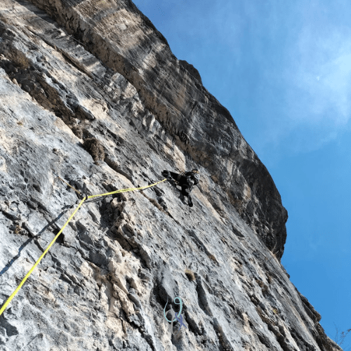 E invece no, mi blocco a metà parete con i piedi appoggiati sull’unica stretta cengia per riposare, provo e riprovo a fare il passo per superare il tratto, ma la tacca da prendere è sempre più in alto di dove arriva la mia mano. Azzerare non posso perché gli spit su 25 metri sono solo 4. Infine trovo la sequenza giusta e raggiungo la seconda sosta con estrema soddisfazione. Tiro liberato.