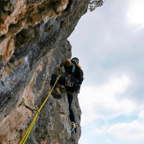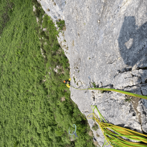 Ci incamminiamo lungo il sentiero che porta alle pareti del Monte Pastello, che osserva l’Adige, si erge tra i Monti Lessini e domina la vallata. Un ultimo tratto in salita nel bosco e ci siamo: ci separano dall’attacco della via di oggi il primo tiro della via 40 Galee e un breve traverso su cengia erbosa con corda fissa.