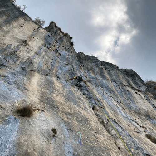Scalarla è stata una bella esperienza ricamata con alcuni dettagli inaspettati: l’inebriante profumo delle erbe aromatiche che di tanto in tanto incontri lungo la salita dove appoggi la mano, i parapendii che ti volano accanto e di cui ti accorgi all’improvviso perché probabilmente ti senti osservato. E poi le nuvole, che compaiono proprio quando il sole sta facendo capolino al limite estremo della parete e che veloci scorrono, mentre segnano il tempo che va e non ritorna mai.