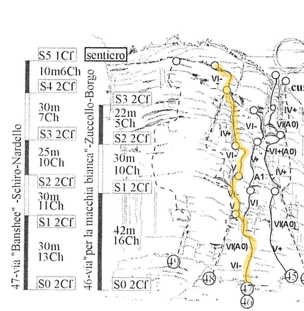 L’ho chiodata in più riprese nell’estate del ’93 prima con Paolo Rizzardi e poi con Luca Nardello. Banshee è stata per 10 anni la più facile del Monte Cengio fino al 2014, quando è arrivata “Erica e Alice”. E per 10 anni è stata la via del primo approccio alpinistico per la maggior parte dei nuovi arrampicatori della Val d’Astico e dintorni… Dato che era la via più facile, ci portavamo i nuovi allievi: diciamo che la consideravamo una scuola elementare avanzata!”