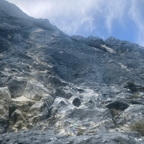 La via presenta gradi dal IV+ al VI A0. Il primo tiro è in comune con la via La macchia bianca (trovi qui le informazioni principali su questa via) fino alla prima sosta, visibile a sinistra verso la via Giancarlo Milan (una bellissima via di cui ho parlato qui).