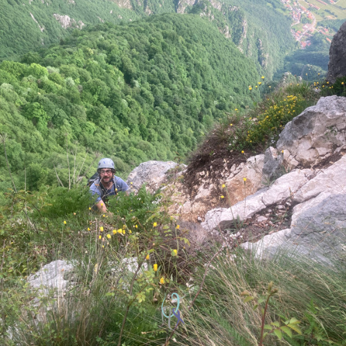 Dopo aver salito il tiro iniziale su chiodi a pressione di precedenti arrampicatori, in poche ore Mario ha condotto la cordata fino al sentiero .