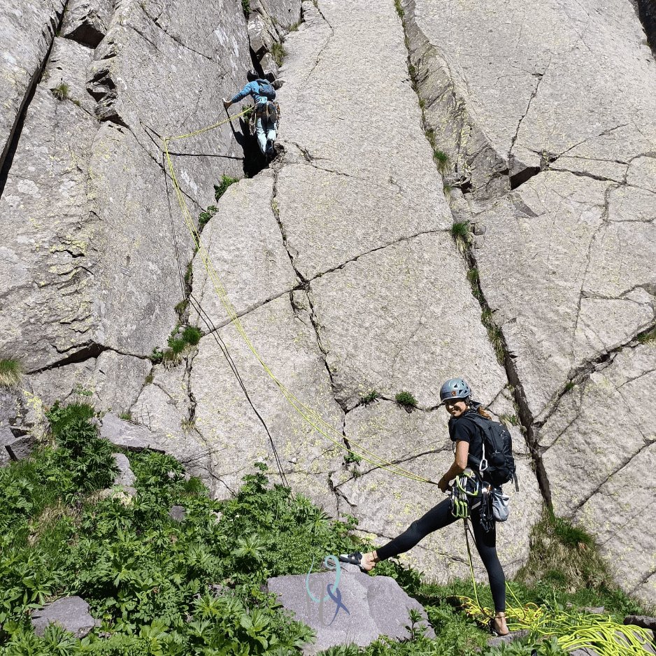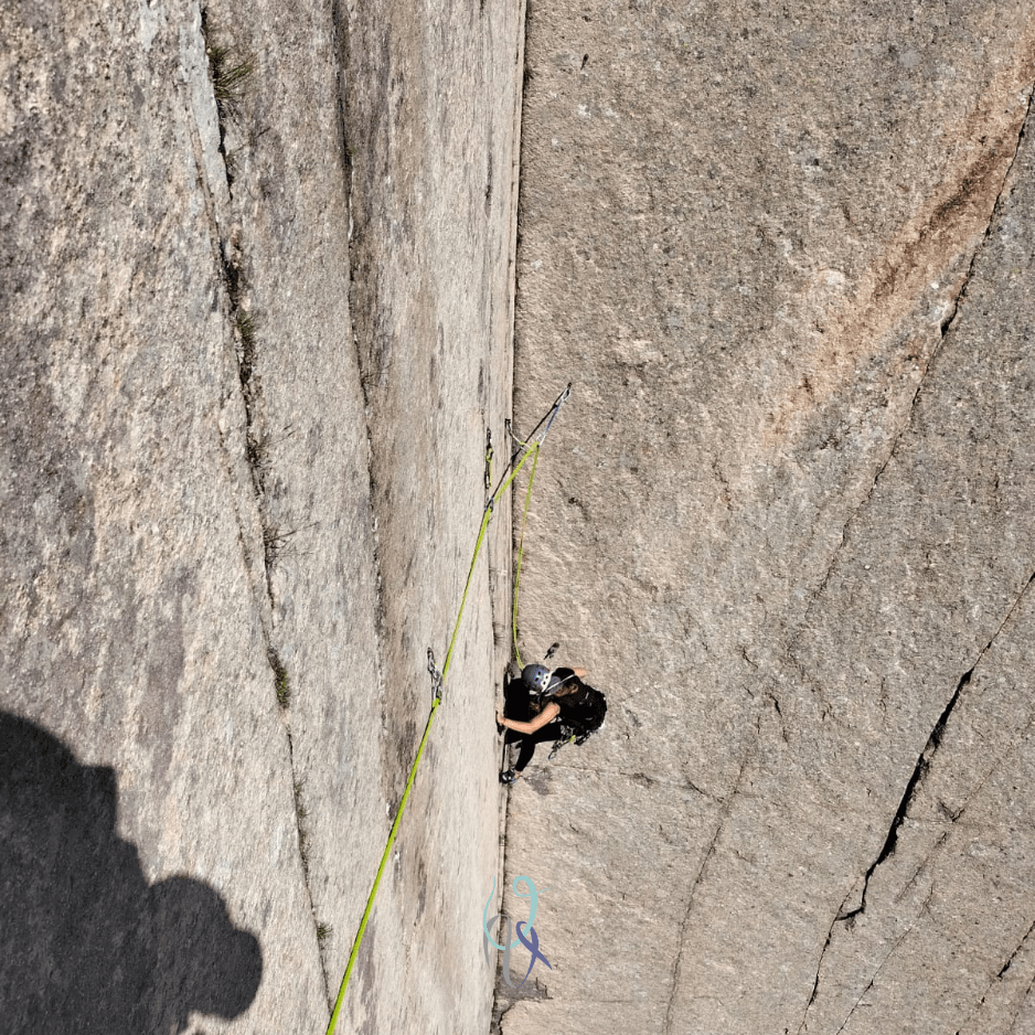 “Ancora!”, sento urlare da sotto. Con tutta la rabbia repressa della settimana, batto fintanto che sono sicura possa tenermi. Ci aggancio un rinvio per sollevarmi, piede sul cordino che mi fa da staffa e… o va o volo. Finalmente arrivo allo spit successivo.