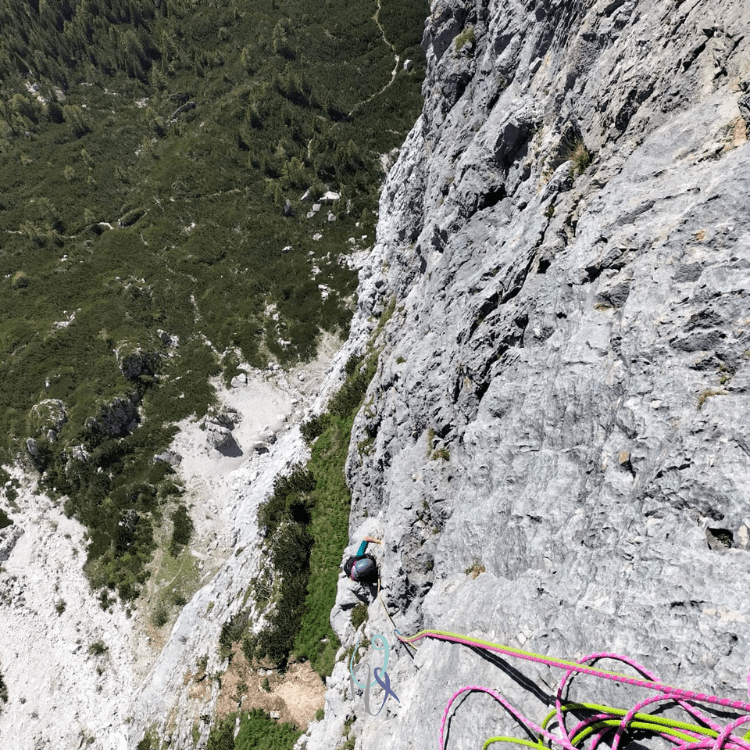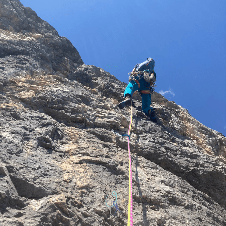 Il terzo è un tratto di 40 metri di IV dove si attraversa anche una cengia erbosa fino alla sosta da cui parte il tiro chiave, il quarto. Sale Fede. La successione di passi prima della parte di IV+ prevede un 6b, un 6c e un altro 6b. Aggiungi protezioni distanziate e ti lascio immaginare la “scioltezza”.