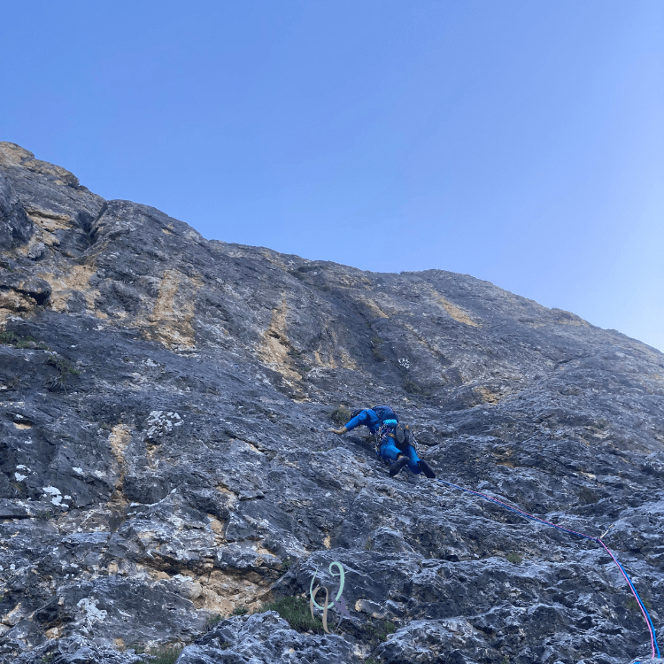 Tutto inizia con lui che mi invita a unirmi alla loro sosta e che mi dice di passare pure avanti. È con una coppia di clienti di circa 70 anni. È una guida alpina. Gli chiedo com’è la loro via e che la nostra è molto bella. Allora mi dice che conosce molto bene le vie di Grill, perché ne ha aperte parecchie con lui. Nel frattempo arriva Fede, che ha sentito l’ultima frase e senza troppe cerimonie gli chiede il nome. Florian Kluckner. Florian Kluckner! Caspita, è proprio lui! Lo conosco solo di nome e wow, che coincidenza averlo incontrato proprio in una via di Grill.