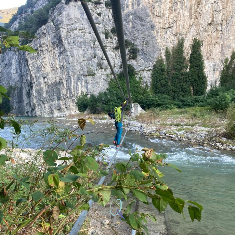 Passiamo Pietramurata, il monte Casale con le sue splendide vie, arriviamo a Sarche e subito dopo aver parcheggiato l’auto in una stradina davanti a un rudere, torniamo sulla statale a piedi, imbocchiamo una stradina che ci porta al fiume e lo attraversiamo, in bilico su un ponte composto da cavi in acciaio. Troppo alto per me il cavo in alto: passo un cordino, lo lego al moschettone e mi trascino un piede dopo l’altro passando alla riva opposta. Qui ci incamminiamo qualche metro fino alla parete.
