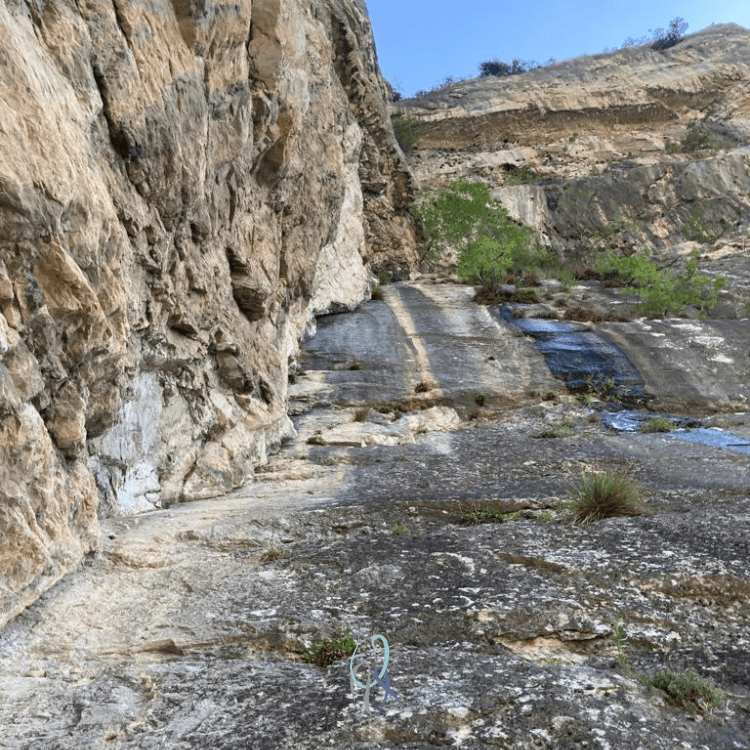 Devi aspettarti sì un diedro, ma composto a sinistra da una parete verticale di roccia somigliante a tanti parallelepipedi di diverse dimensioni incastrati l’uno con l’altro, insieme ad altre pietre di diverse forme che danno alla superficie un aspetto frastagliato.