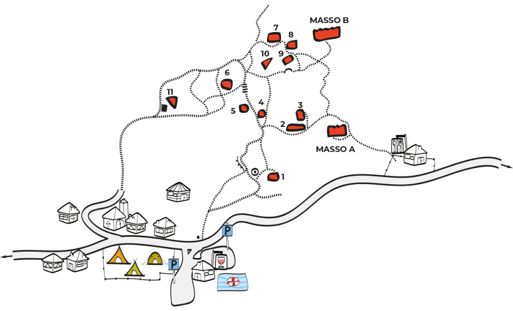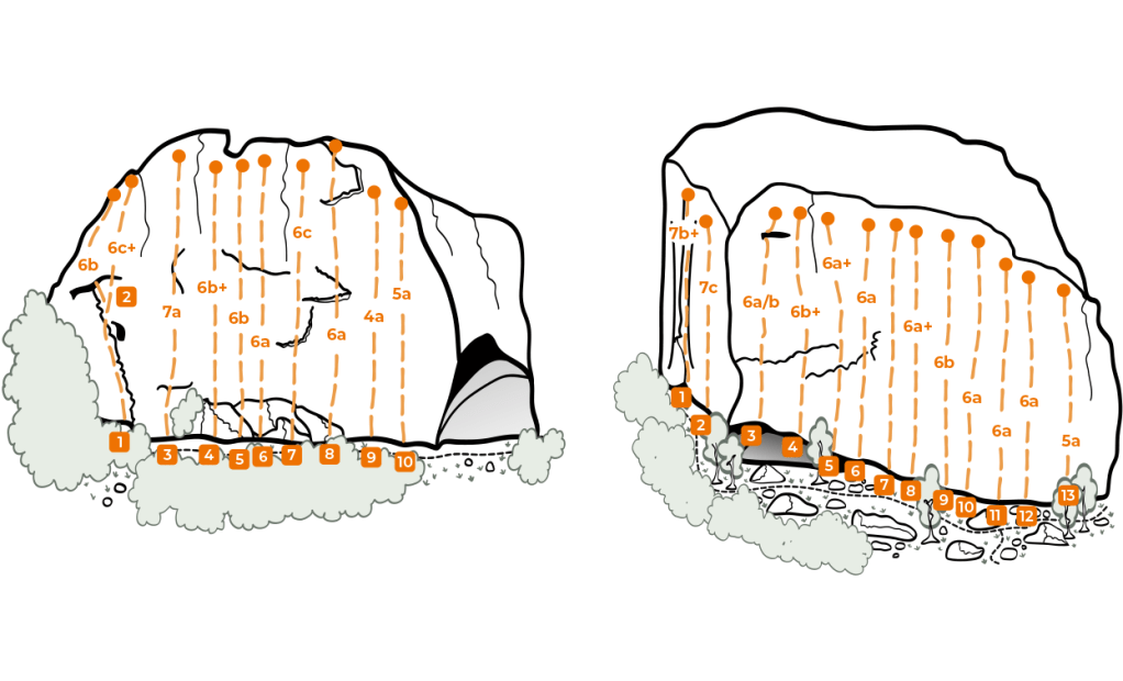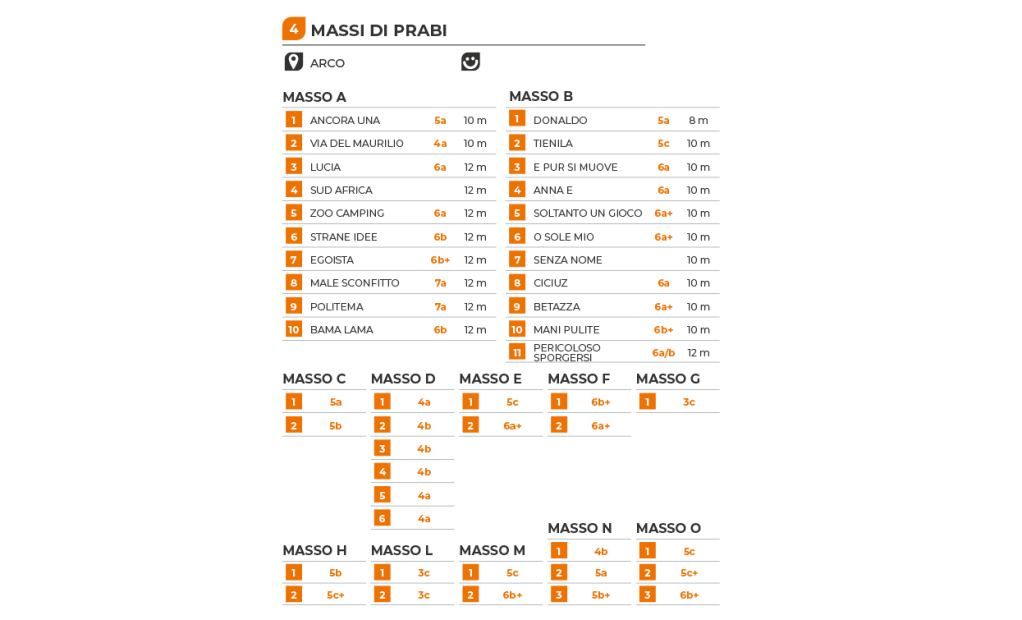 La falesia Massi di Prabi è composta da due grandi massi dove salgono una ventina di tiri e altri undici massi più piccoli con tiri dai 4 agli 8 metri.