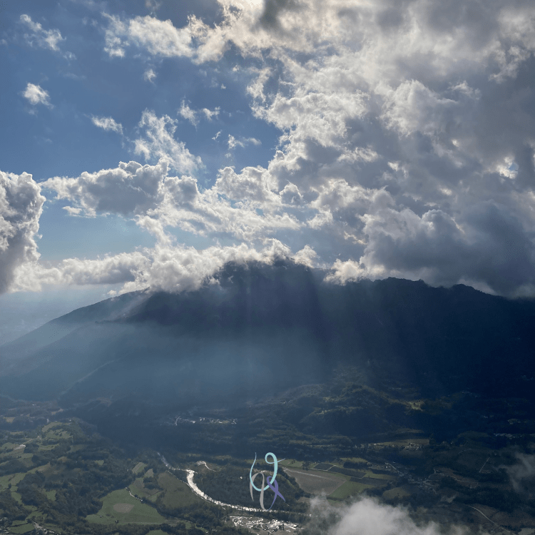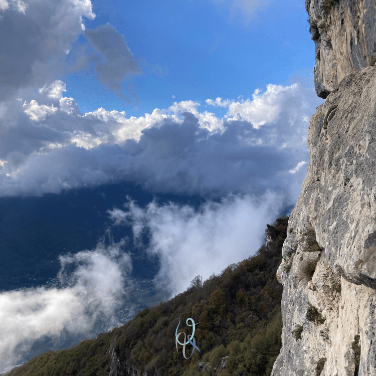 Ci avviamo verso il sentiero che porta alle pareti. Mentre scendiamo le nuvole di vapore salgono dalla valle e ci inebriano con il loro colore avorio. Il sole sparisce. Arriviamo all’attacco della via Giancarlo Milan e qualche goccia di pioggia cade sulle nostre giacche impermeabili, sulle corde e sui caschetti. Che fare?