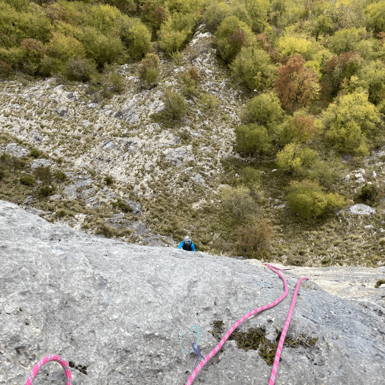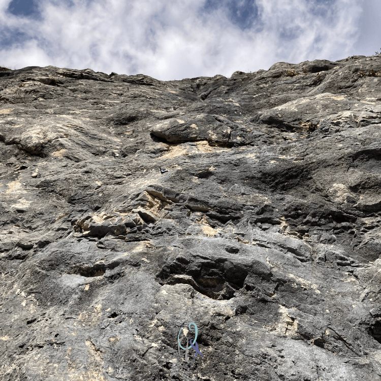 Il primo tiro si presenta subito con una roccia malconcia, ma, dopo il breve e divertente traverso a sinistra, inizia a delinearsi una parete splendida. Lo strapiombo di 6c+ è il primo ostacolo, perché è solo l’inizio!