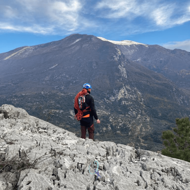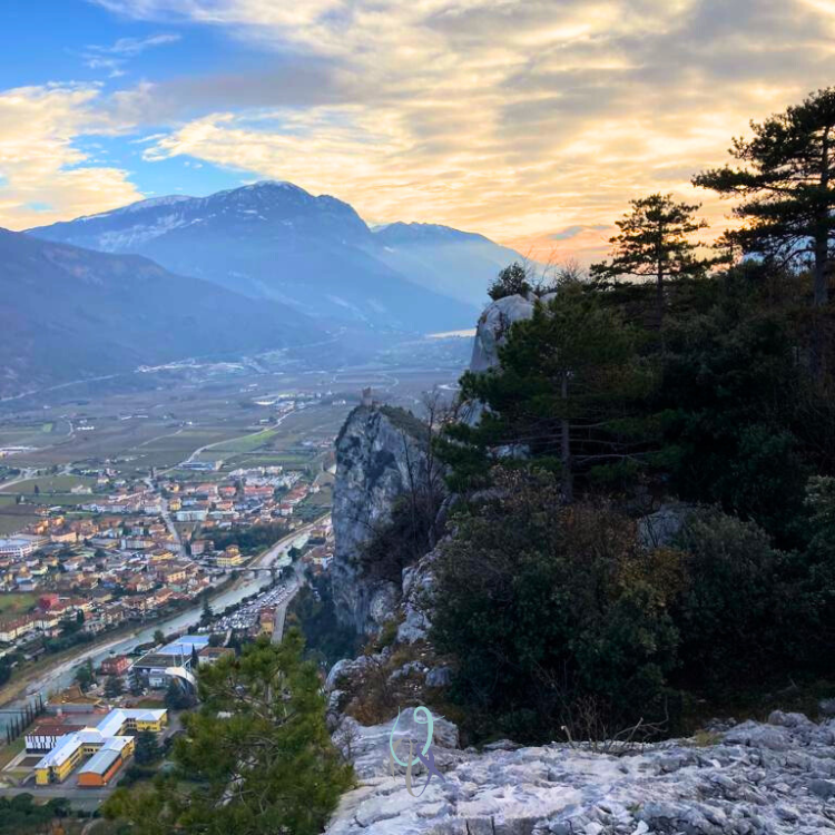 Ma osservando il mio compagno di cordata smarrito nei suoi pensieri, percepisco un’atmosfera particolare su questa roccia pallida e davanti al panorama di Arco con il suo castello.