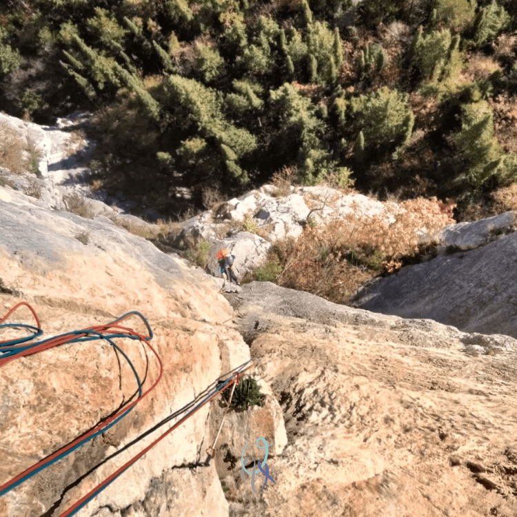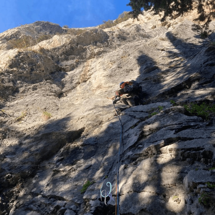 In prevalenza su diedri e fessure, l’arrampicata è atletica, spesso di forza e di equilibrio. La linea è davvero logica, anche se gli incroci con altre vie (ovunque, non solo qui) non mi entusiasmano, ma siamo sinceri: ormai trovare uno spazio libero in qualche bella parete è come vincere alla lotteria, concordi?