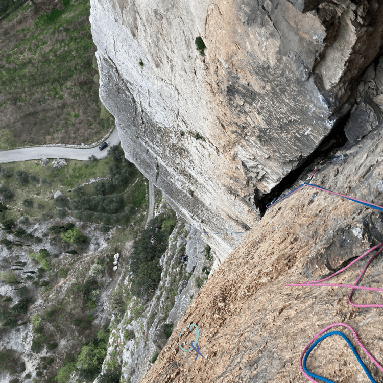 Arrivo alla sosta e osservo la fila di rari spit della via Zanzara e Labbradoro che salgono in verticale. Ma noi dobbiamo traversare a destra: sospiro di sollievo.