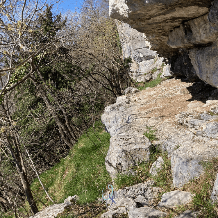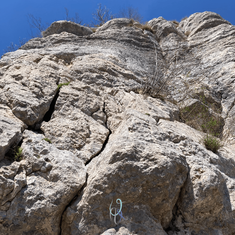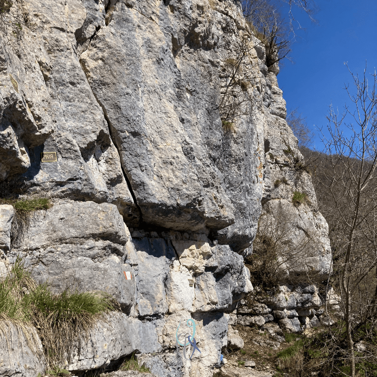 Al nostro passaggio riusciamo ad ascoltare qualche goccia che cade sulla roccia a terra, perché in questa parte della falesia siamo soli. Arriviamo al settore Le placche di Foza.