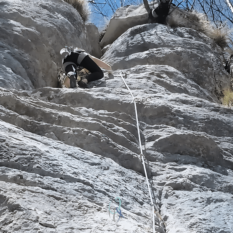 L’anfiteatro, che mi accoglie e che si affaccia sulla valle, è tappezzato di striature, sfumature della roccia e tratti ancora bagnati, che lo rendono ancora più maestoso. Qui i tiri partono con strapiombi netti, che lasciano poco spazio alla riflessione e di più all’istinto e alla forza, per poi collegarsi a lunghezze ad arco con belle canne, meno spietate ma pur sempre dure per gli avambracci.