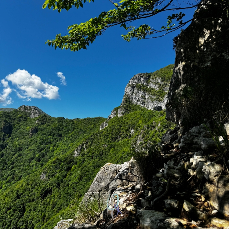 Puntiamo a salire l’itinerario originale, partendo da una cengia panoramica che guarda la valle e il Cimone, che visto da qui è protagonista di un quadro dallo sfondo azzurro abbagliante.