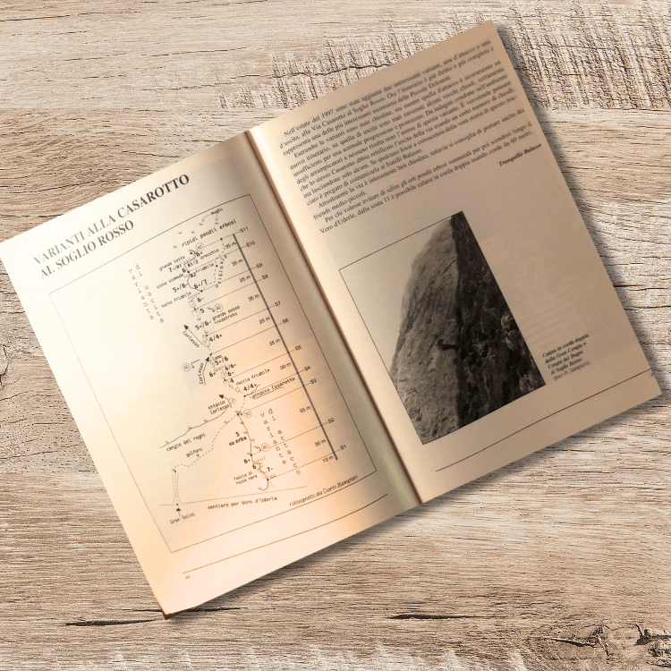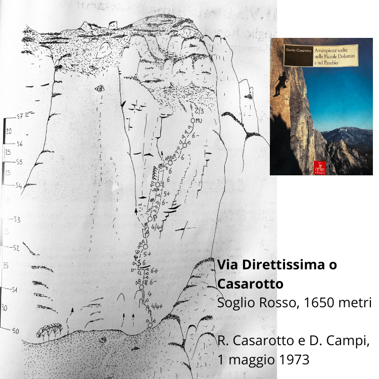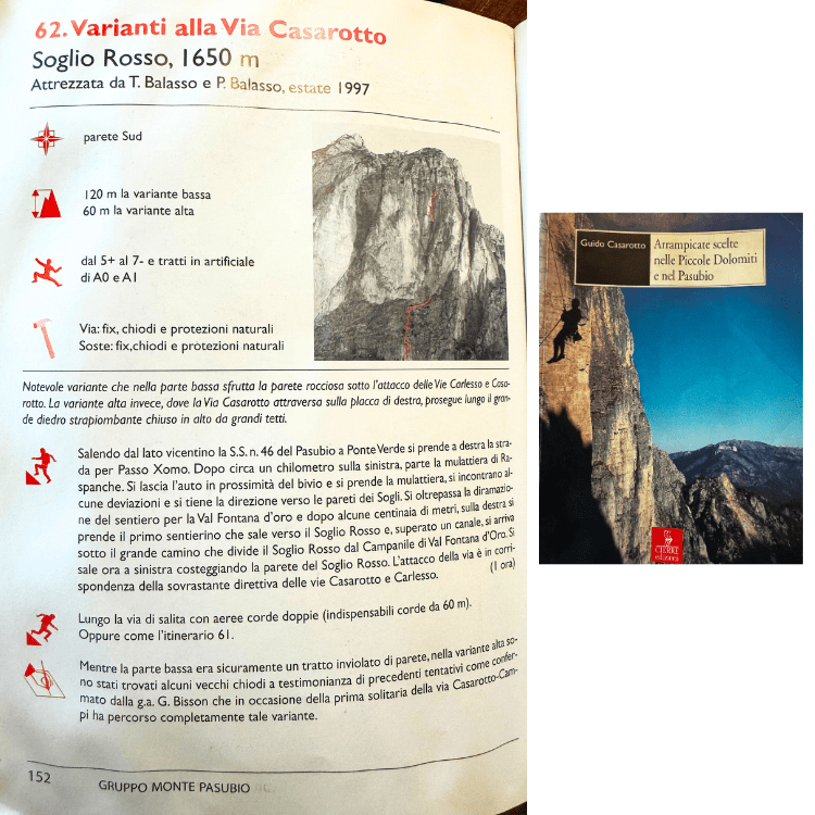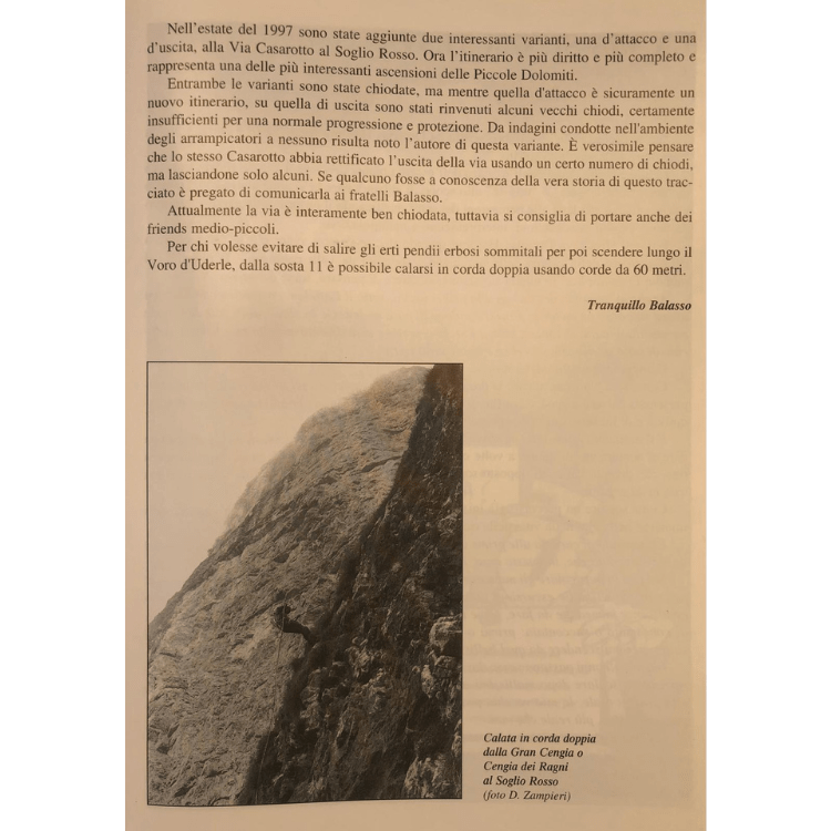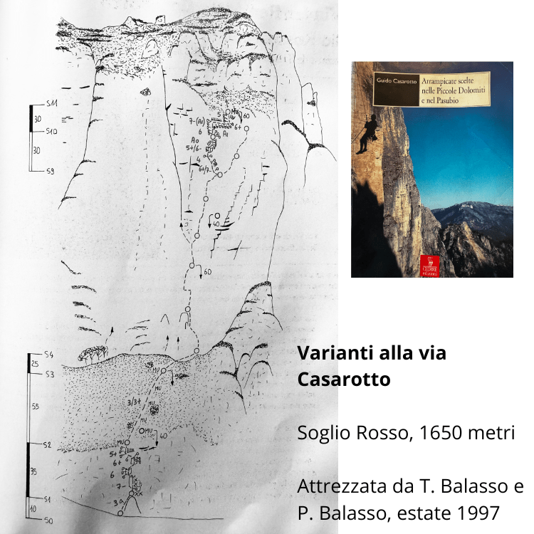 ‘Nell’estate del 1997 sono state aggiunte due interessanti varianti, una d’attacco e una d’uscita, alla Via Casarotto al Soglio Rosso. Ora l’itinerario è più diritto e più completo e rappresenta una delle più interessanti ascensioni delle Piccole Dolomiti. Entrambe le varianti sono state chiodate, ma mentre quella d’attacco è sicuramente un nuovo itinerario, su quella di uscita sono stati rinvenuti alcuni vecchi chiodi, certamente insufficienti per una normale progressione e protezione. Da indagini condotte nell’ambiente degli arrampicatori a nessuno risulta noto l’autore di questa variante. È verosimile pensare che lo stesso Casarotto abbia rettificato l’uscita della via usando un certo numero di chiodi, ma lasciandone solo alcuni. Se qualcuno fosse a conoscenza della vera storia di questo tracciato è pregato di comunicarla ai fratelli Balasso.