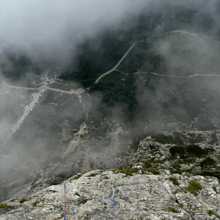 Ma torniamo alla Diretta. Al parcheggio di Campogrosso accostano la loro auto due alpinisti vicentini, con cui percorriamo il tragitto di avvicinamento. Loro sono diretti alla via Ceneri nel vento e ci dicono di aver ripetuto la Carlesso circa due anni fa. Ci sconsigliano il primo tiro, perché poco protetto e molto delicato, da evitare se bagnato perché è obbligatorio entrare in un camino, e ci suggeriscono di salire i primi tiri della via accanto per poi congiungerci. Ma uno di loro afferma “però, così facendo, non potrete dire di aver salito la Carlesso”.