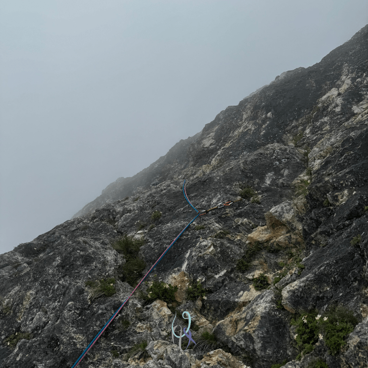 La via poi prende la sua forma migliore: placche, canalini, un bel diedro, lo strapiombino del tiro chiave: tutto è fantastico, la roccia eccezionale se consideriamo il posto in cui stiamo arrampicando. Le protezioni sono rare (tranne nel tiro chiave, ben protetto, di V+), ma non abbiamo mai integrato e ho scelto di saltare il chiodo sul traverso a destra del quinto tiro per poter poi collegarlo al sesto che prosegue verso sinistra.