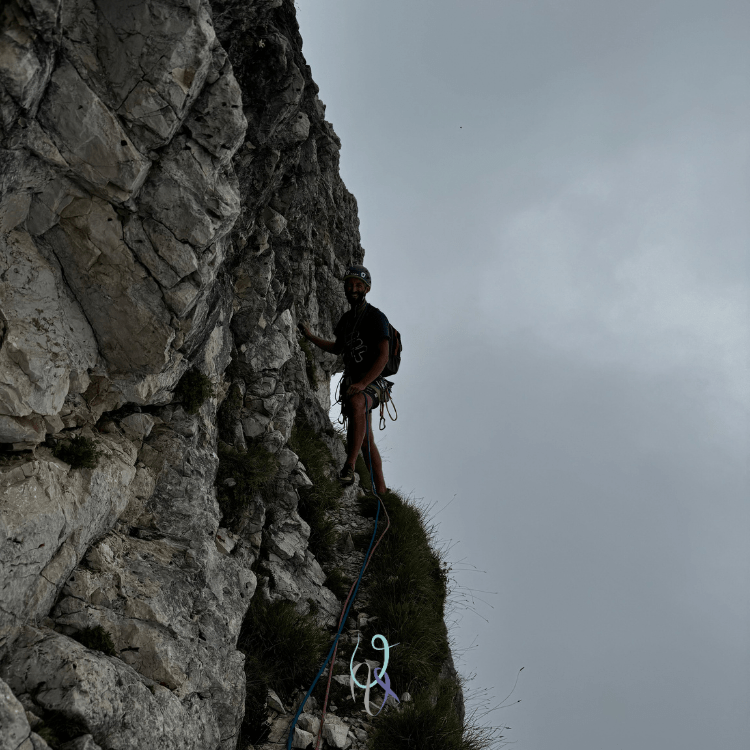“E pensare che l’hanno percorsa con gli scarponi”, mi dice il mio compagno di cordata Ale. E ha ragione: se penso a come la punta degli scarponi poteva stare su alcuni appoggi stretti soprattutto nella placca centrale… be’, wow!