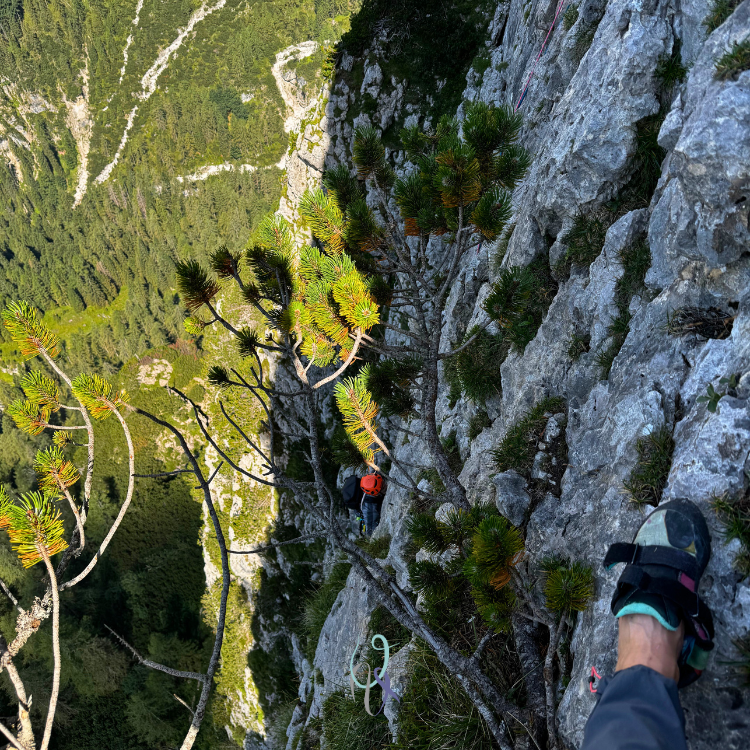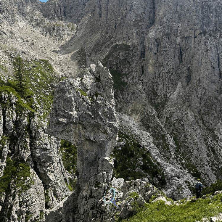 Scendiamo lungo lo stretto sentierino a strapiombo (qui confesso che mi è sembrato peggio di una via sprotetta) fino a raggiungere il monolite, il Gendarme, che grazie a non so quale legge della fisica è lì, sopra un piedistallo, a fare la guardia.