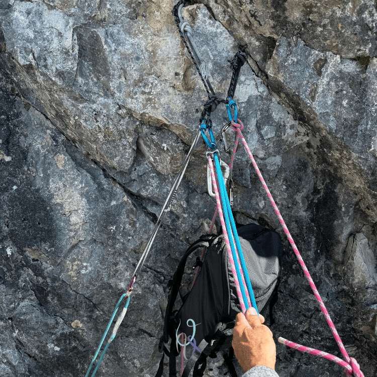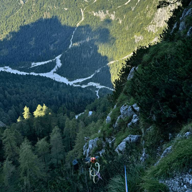 Aggiriamo il monolite e attrezziamo le calate: tre di venti metri, fino al sentiero che ci conduce dove attacca la via e poi giù verso il rifugio Treviso.