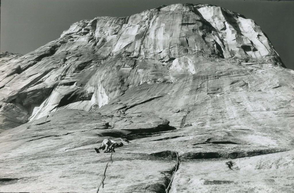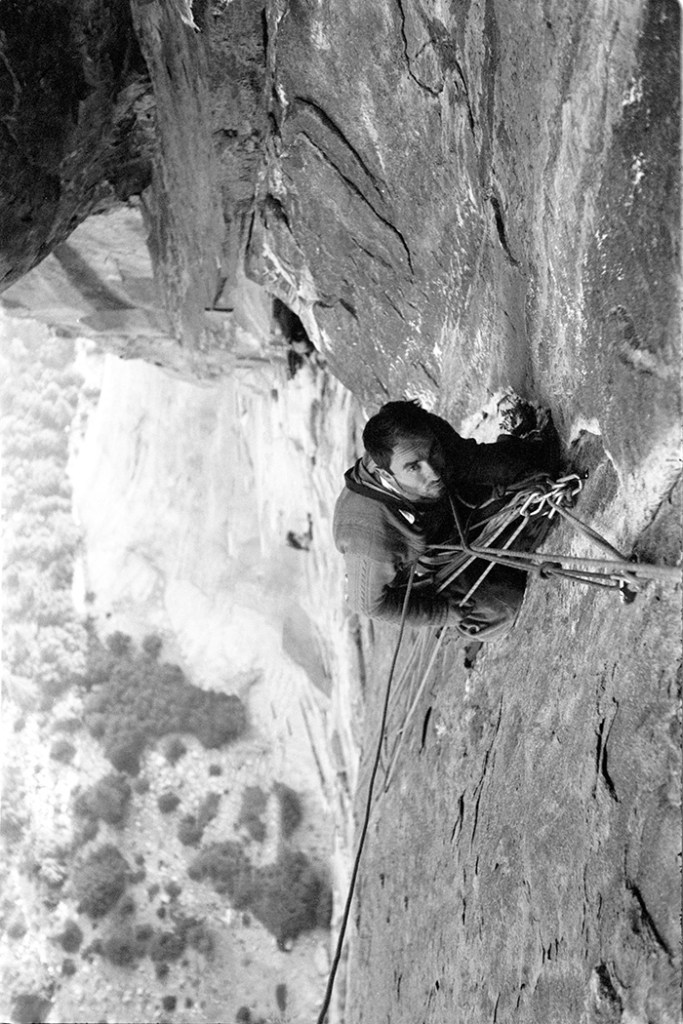 [Nella foto qui sopra si vede Royal Robbins salire The Salathé Wall, che “è stata battezzata così in onore di uno dei pionieri dell’arrampicata statunitense, John Salathé. È’ stata aperta da Royal Robbins, Chuck Pratt, Tom Frost in nove giorni e mezzo nel settembre del 1961, in uno stile rivoluzionario e, per quei tempi, assolutamente senza compromessi. È stata anche la prima big wall ad essere liberata su El Capitan da Paul Piana e Todd Skinner in 9 giorni nel 1988, mentre nel 1995 Alexander Huber è stato il primo a salire tutta la via in libera da capocordata” (fonte: www.planetmountain.com). Se sei curiosa/o, guarda il video di Adam Ondra che tenta di salirla a vista!