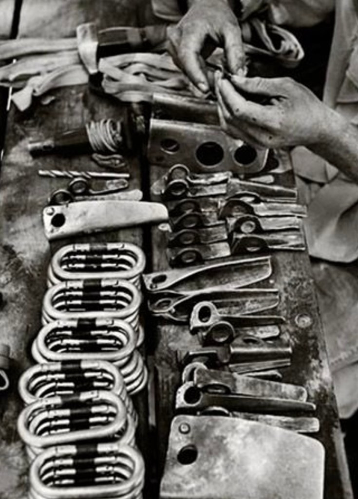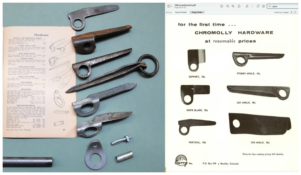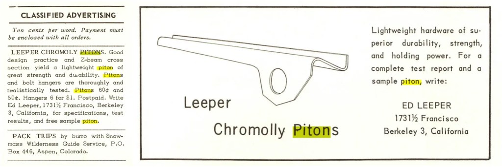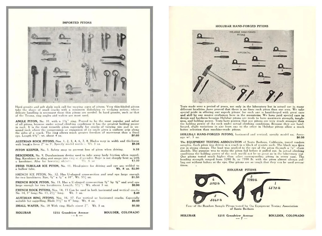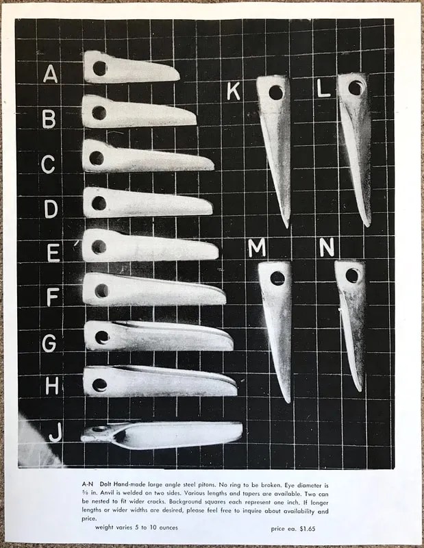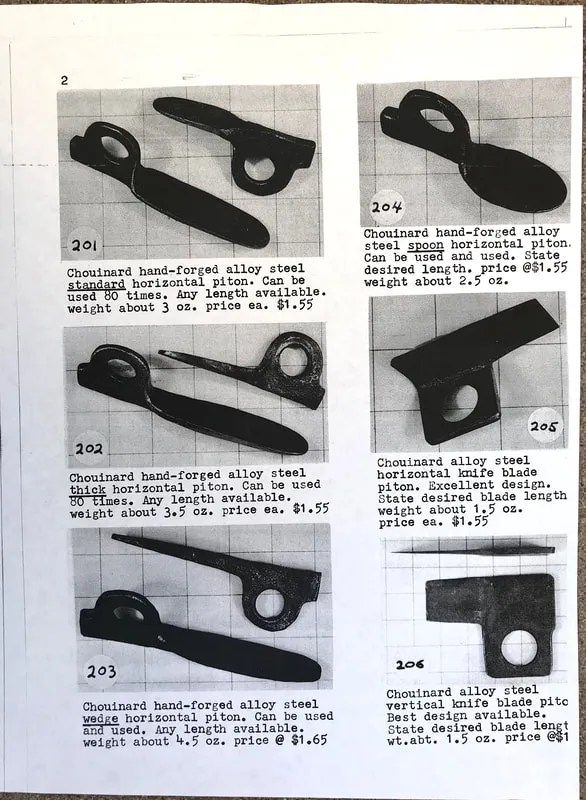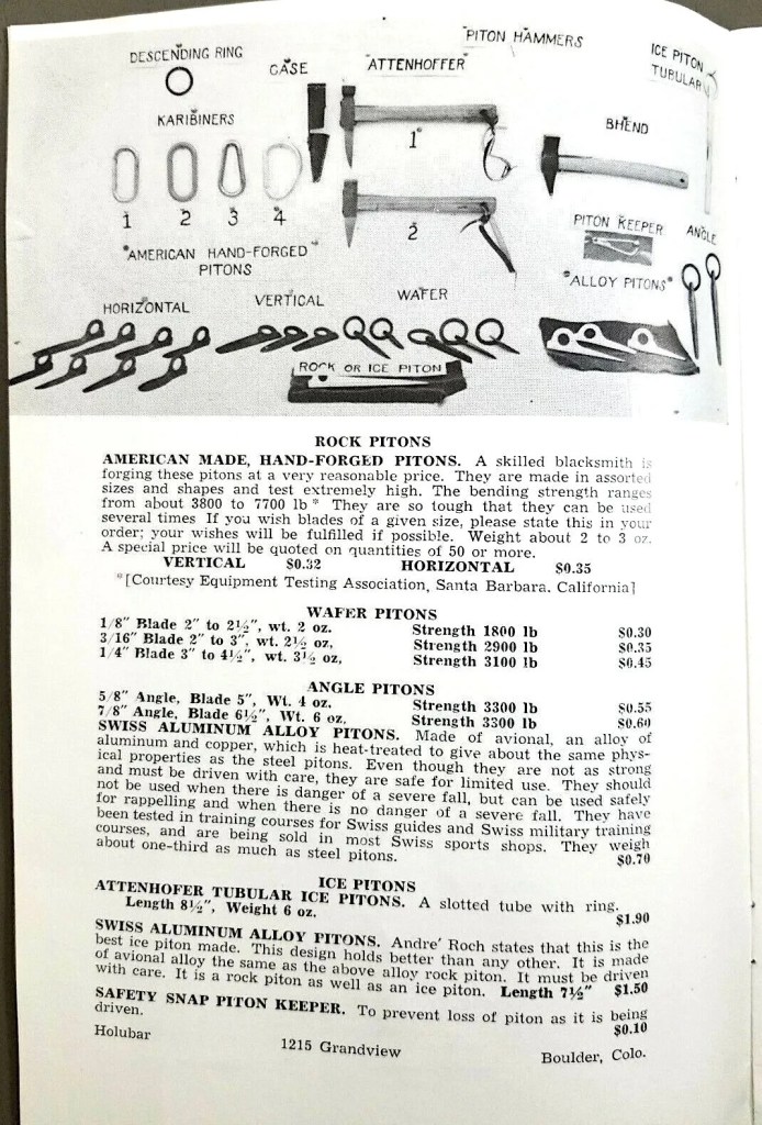 Alla fine degli anni ’50 Chouinard forgiò chiodi in acciaio ad alta resistenza e introdusse anche un moschettone in alluminio forgiato ad alta resistenza nel 1958. A metà degli anni ’60 Chouinard era il principale fornitore di chiodi in cromo di tutte le dimensioni (catalogo Dolt 1960).