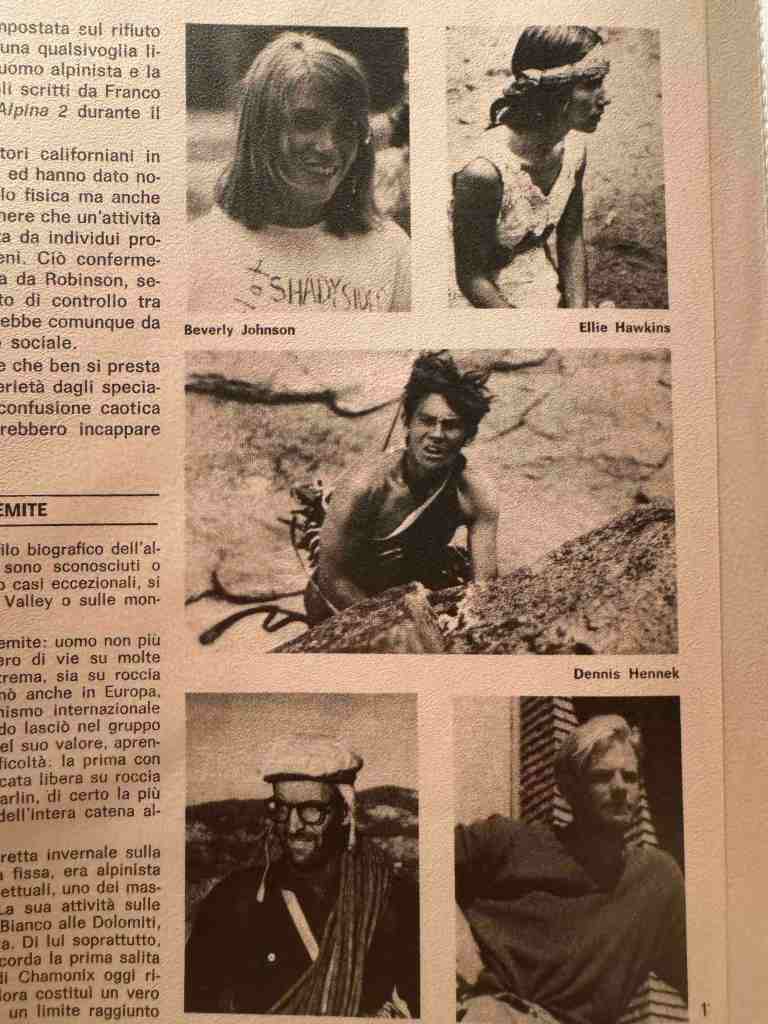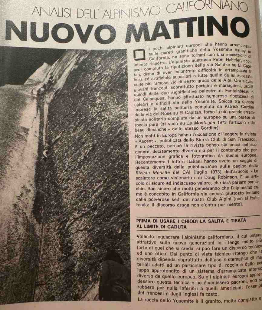 Ebbene ho viaggiato con l’immaginazione (eh sì, non li ho mai visti dal vivo quei mezzi!) tra le righe dell’articolo Il Nuovo Mattino, analisi dell’alpinismo californiano, di Gian Piero Motti. Sì, ancora lui, e che ci posso fare: quando ci si innamora, letterariamente parlando, si finisce per parlare sempre dell’oggetto dei propri pensieri. Ma poi, suvvia, chi meglio di lui per un’analisi approfondita sul tema?