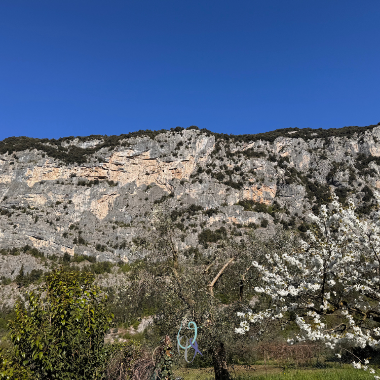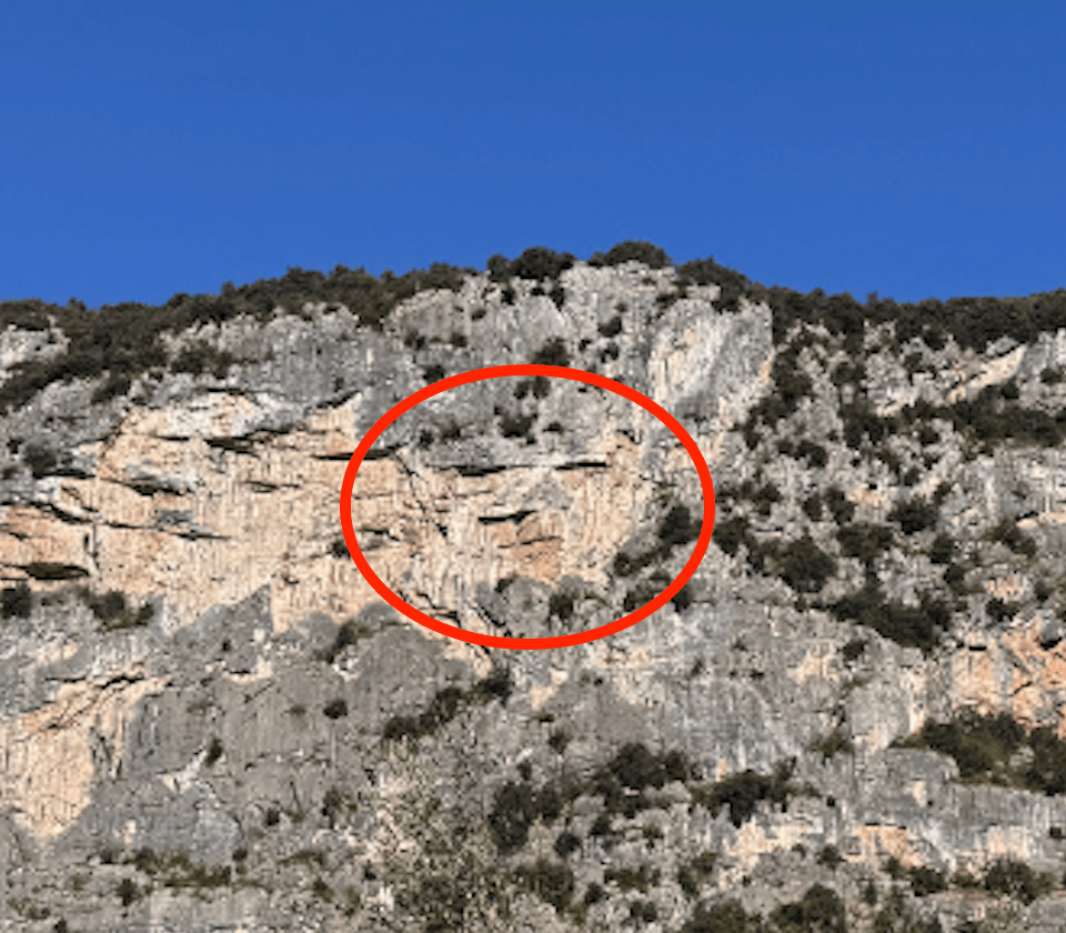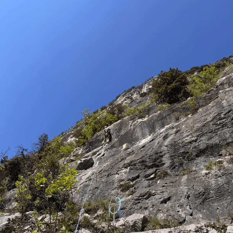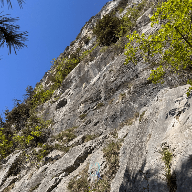 Un ottimo riferimento dato che, dal parcheggio di Dro attraversiamo il ponte e in pochi minuti giungiamo all’attacco attraverso le tracce nel boschetto.
