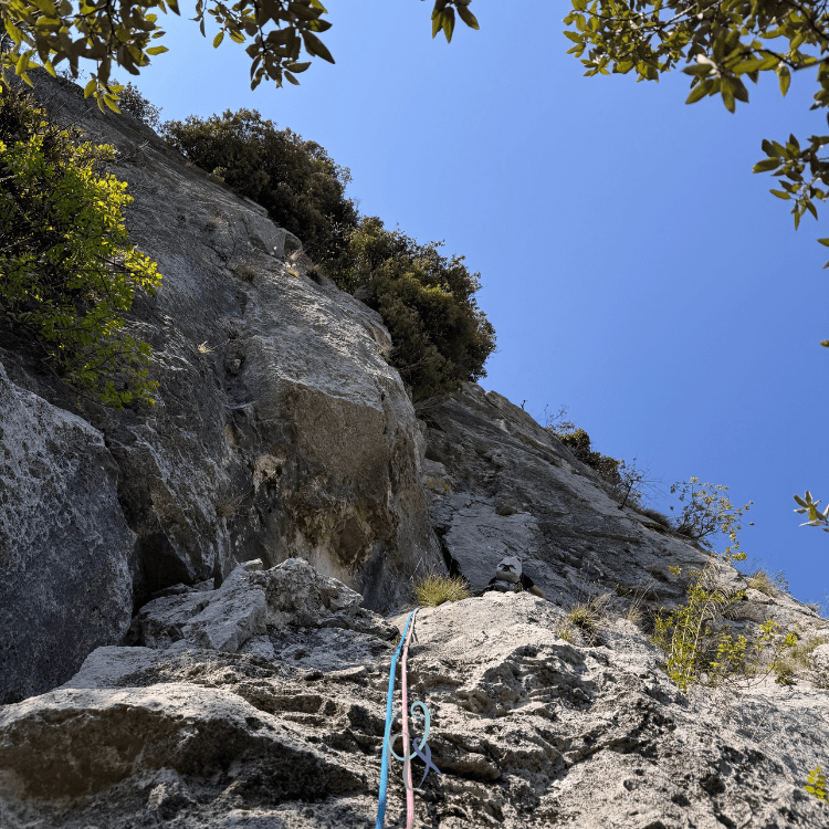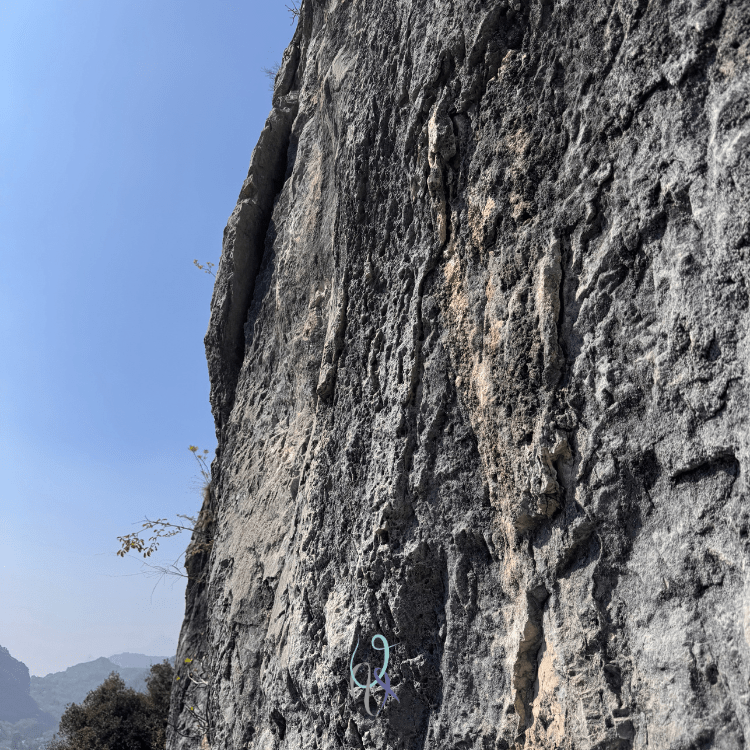 La via si trova a sinistra della linea La piccola piramide, sopra uno zoccolo. La ricca vegetazione ci fa pensare che la via sarà interrotta da tratti di terra e piante, ma non è così (tranne un passo difficile a metà del terzo tiro dove le prese buone sono un po’ sporche di terra, ma non siamo schizzinosi).