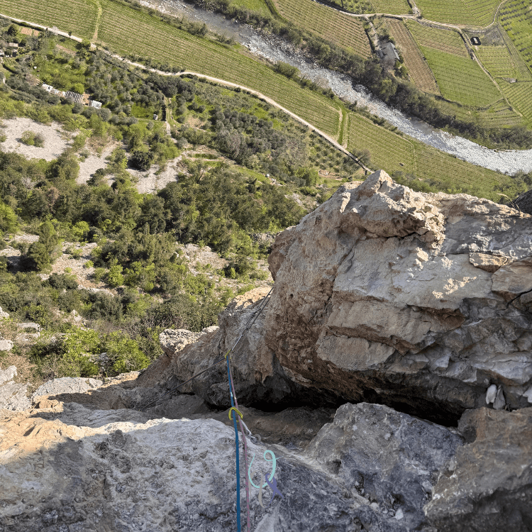 Tecnica la placca appoggiata del secondo tiro, divertenti le lame del quarto tiro (che sembrano non finire mai!), molto delicato il passaggio su placca del quinto tiro per arrivare a un’altra lama (potrebbe essere un 6b, ma la difficoltà sta soprattutto in alcuni appigli lucidi e nell’aleatorietà del breve tratto) e poi ancora lame e placche fino al meraviglioso diedro rosso con al centro una grande fessura: la roccia diventa qui meno porosa, le prese talvolta più svase, le canne che si intrecciano lungo il diedro sono affascinanti, la resistenza è messa ancora a dura a prova (è toccato a me, sono stata fortunata: ti consiglio di partire per secondo!) .