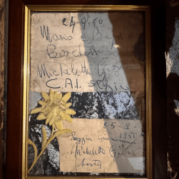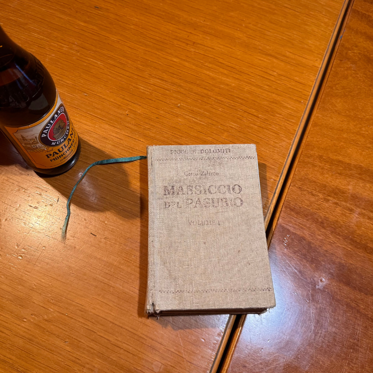 AM: Ma loro avevano salito la variante: non avevano percorso tutto il camino tagliando a sinistra come i primi salitori, ma sono saliti dritti con 100 metri di variante. Io e Sandro abbiamo fatto lo stesso e abbiamo trovato un segno che non ricordavo mio padre mi avesse raccontato, una specie di libro di via: una bottiglia all’interno di un buco in una clessidra di roccia. Era una piccola bottiglia di Prosecco, quella di una volta, rovesciata per non farci entrare acqua, con dentro un cartoncino arrotolato firmato da mio padre. Ricordo che questo tiro lo salì Sandro e da sopra mi urlò “non puoi immaginare cosa ho trovato!”. Quando ho visto la bottiglia, è stata davvero una gran sorpresa.