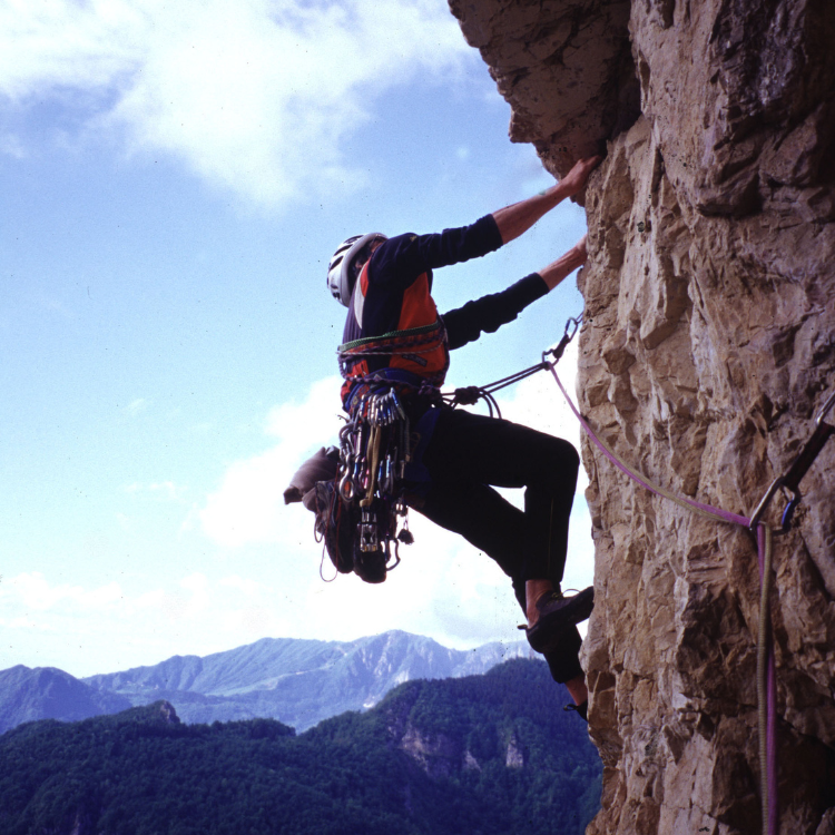ADN: Nelle prime palestre che frequentavo ricordo che su tiri di 25 metri, ad esempio, c’erano 4 o 5 spit: i run out, magari su placche lisce, erano notevoli e lì dovevi stringere il c… per salire. Io non ho mai arrampicato in falesia su gradi più alti rispetto a quelli che facevo in montagna e di questo ne vado fiero. Forse non ho salito chissà che gradi a vista in palestra, ma in montagna anche su gradi per me alti io sentivo di avere la sicurezza di poterli superare, chiodi o senza.