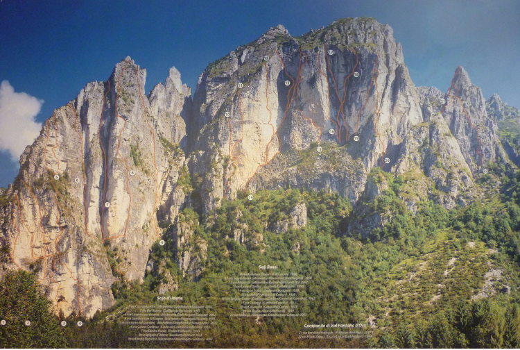 ***Via Angoscia. “Dal basso in cinque riprese e con l’uso esclusivo di protezioni tradizionali, è stata aperta la via più impegnativa sia tecnicamente che psicologicamente dell’intero gruppo delle Piccole Dolomiti-Pasubio. ‘Angoscia’ sale diretta sulla parte più repulsiva ed impressionante del Sojo Rosso, attraversando tratti di roccia poco consistente nella prima parte, tetti, strapiombi e tratti di roccia compatta e priva di appoggi fino a raggiungere la colata nera che porta all’imbocco del diedro finale, dove la roccia diviene compatta e ben lavorata. Per una ripetizione portare con sè dadi e friends delle misure più piccole e una serie di chiodi ben assortiti. Le soste sono a spit da 8mm. piantati a mano e dalla quarta a salire sono tutte nel vuoto. Da tenere ben presente che una volta oltrepassato il tiro del traverso, la discesa in corda doppia non è più possibile. La via è stata percorsa in 8,30 ore in arrampicata libera dagli apritori fino al grado di 7c. Per i tratti con difficoltà superiori i gradi sono indicativi e da confermare.” [Fonte: Planetmountain]