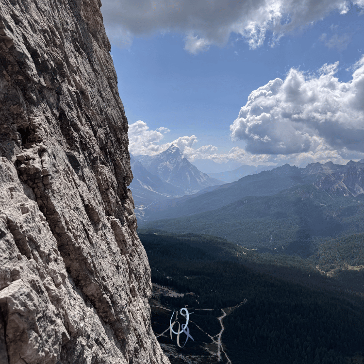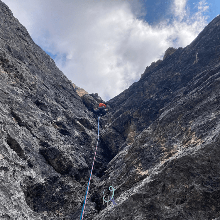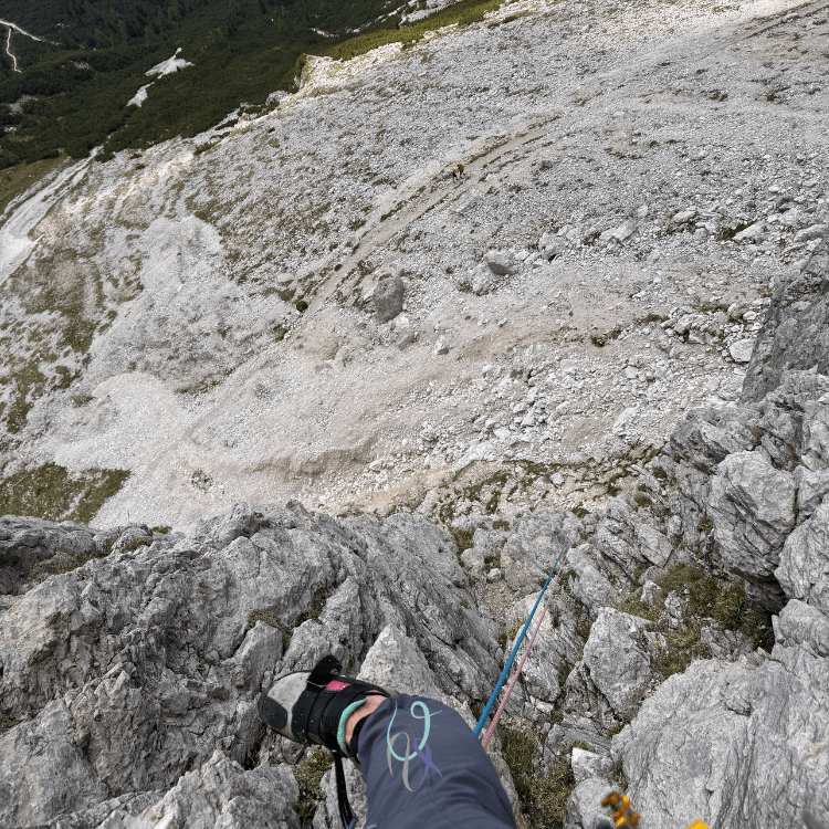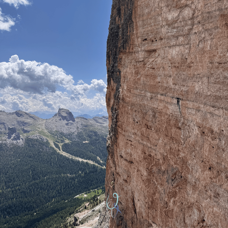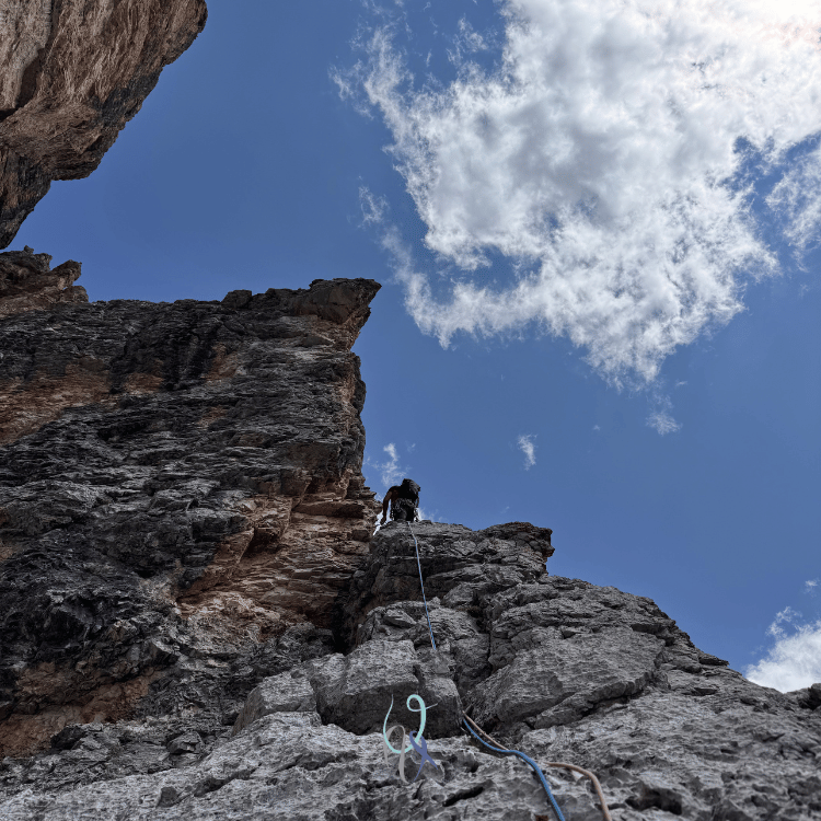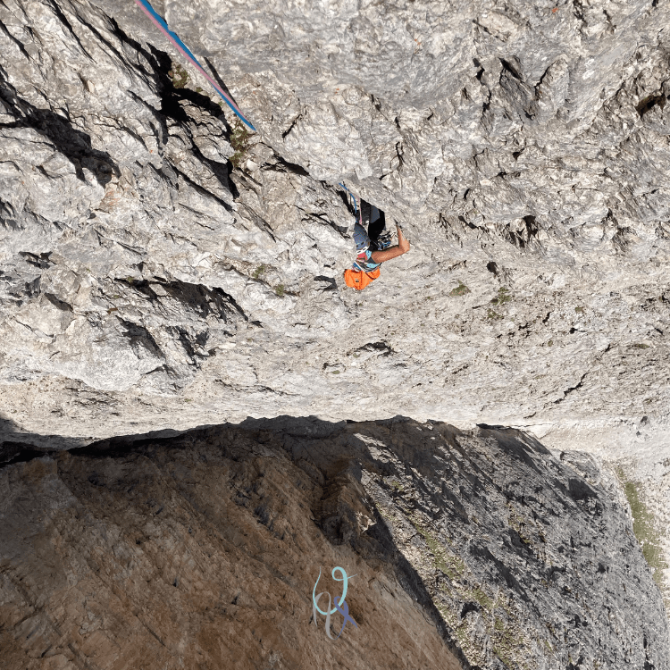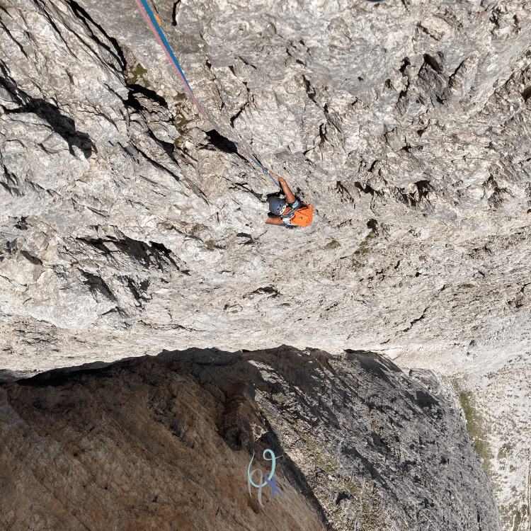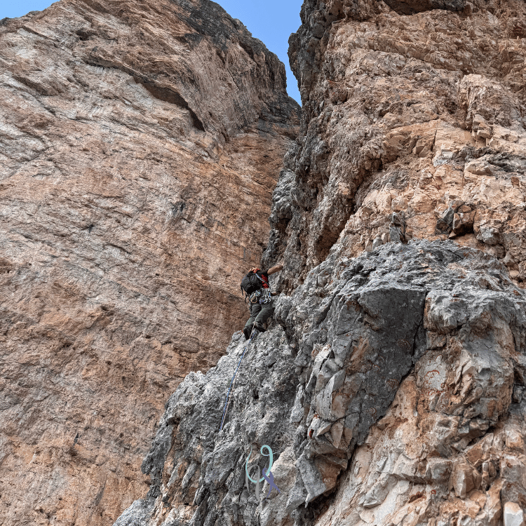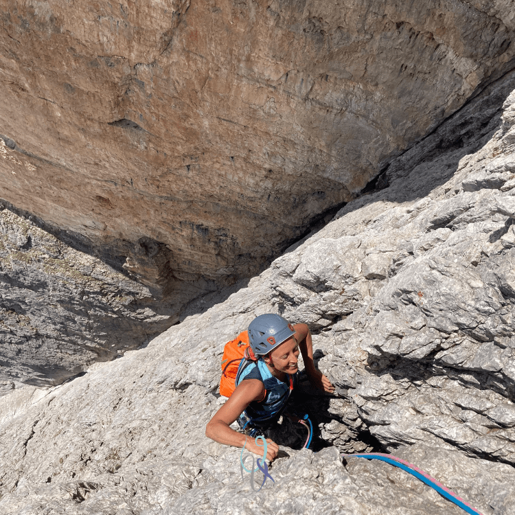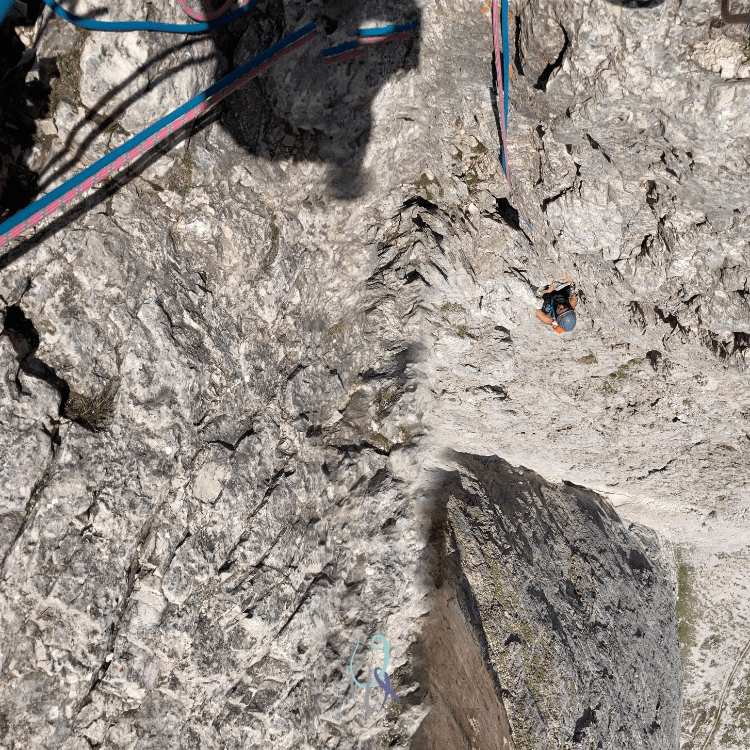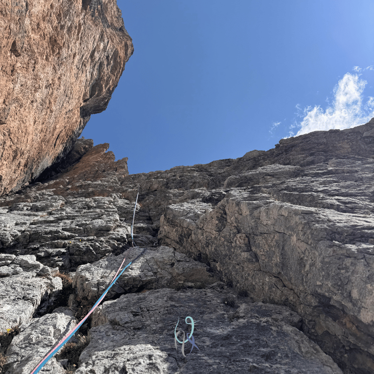Durante la salita la parete gialla verticalissima del secondo spigolo si erge di fianco a me e, come sempre mi capita con i muri dolomitici, osservarla per qualche secondo mi fa perdere l’orientamento: è un’illusione ottica che mi cattura e per un brevissimo lasso di tempo scarico il mio corpo dalla realtà che mi tiene ancorata alla vita quotidiana, respiro, mi guardo attorno, e respiro ancora, inebriandomi del profumo della libertà.