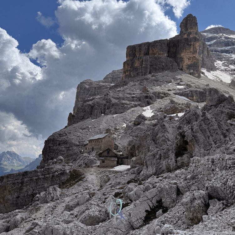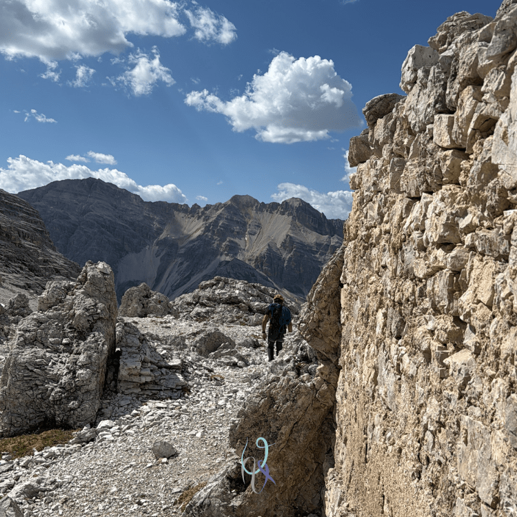 Sul tragitto di ritorno abbiamo attraversato tre piccole lingue di neve, dove è necessario fare molta attenzione a non scivolare. La cengia esposta è breve (sono presenti dei fittoni per chi eventualmente voglia assicurarsi, dato che il dirupo mette un po’ di angoscia) e successivamente arriviamo a un’area caratterizzata da diversi massi, che nascondono, poco più avanti, il rifugio Giussani. Il comodo sentiero di ritorno è verso destra in discesa, tra quel che resta dei ruderi della Prima Guerra Mondiale.