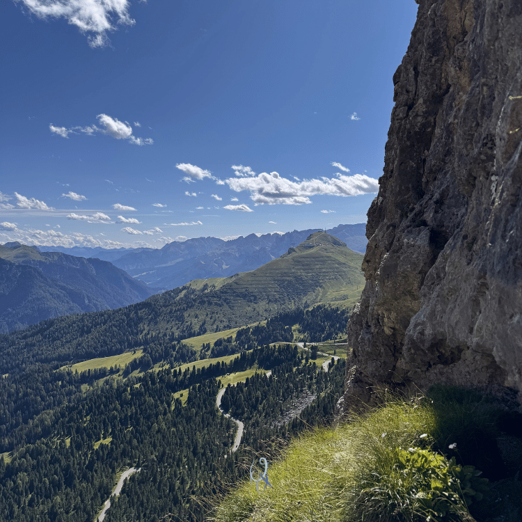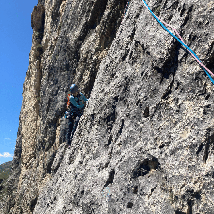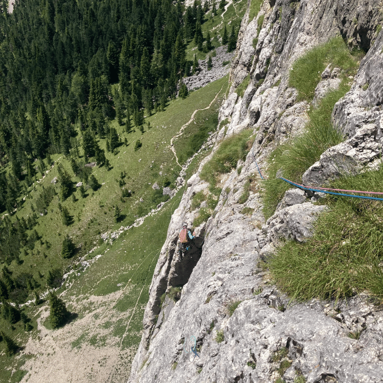 Tutto fila liscio. Fino a un diedro. Al breve diedro che dovrebbe vedersi abbastanza bene per arrivare alla sosta sopra un pulpito. E dato che a me piace complicarmi la vita… Dopo un breve traverso arrivo a un bel diedrino fessurato formato da una conformazione di roccia che sporge creando anche un bello spigolo esposto. Saranno forse 6 o 7 metri, un cordino su chiodo si trova proprio sotto: percorro in verticale un breve tratto di placca e mi infilo su questo diedro-spigolo. Convinta di trovare almeno un chiodo. Ma no. Quindi provo a proteggermi con un friend, dato che il cordino ormai mi è sotto i piedi di qualche metro. Tiene? Una caduta assolutamente no. Come si dice? Psicologico? E vabbè, piuttosto di niente.