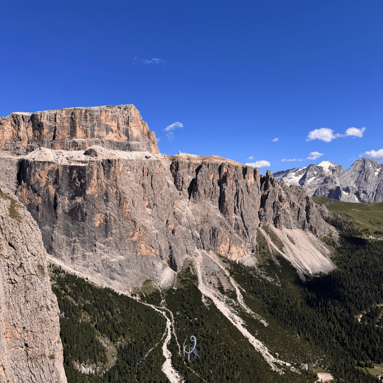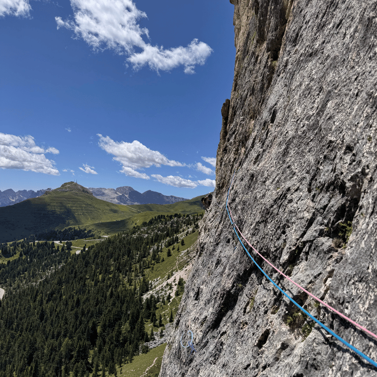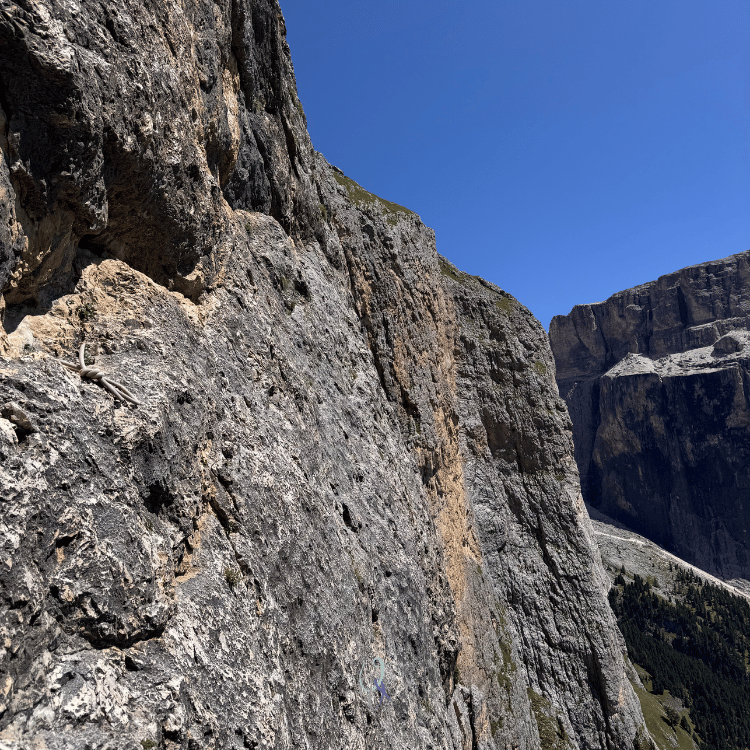 Siamo sulla parete sud del Piz Ciavazes, sono le 9 e intravediamo ancora qualche colata nera dovuta alla pioggia della notte. Ma il sole picchia e il vento è senza inibizioni, si mostra in tutta la sua virilità. Partiamo verso le 10 e come sempre la direzione è in alto.