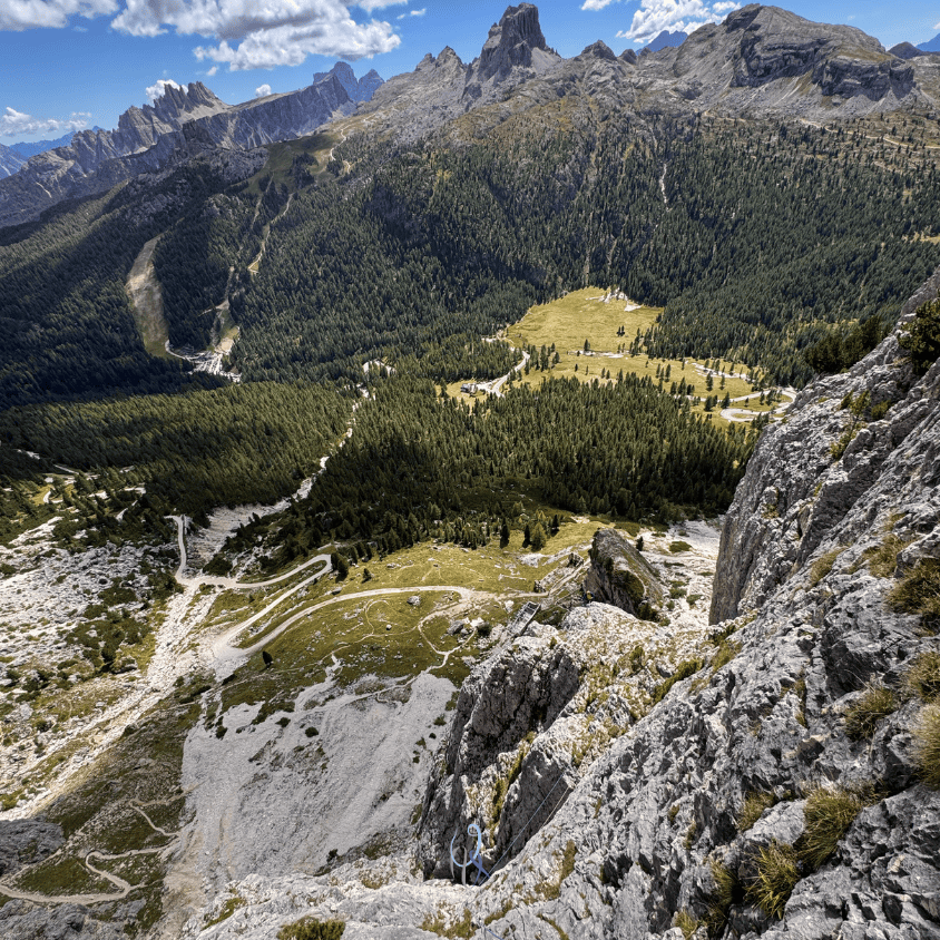 Non potevo chiedere di meglio a questa giornata di inizio settembre: il cielo limpido (qualche nuvola a parte nel primo pomeriggio), temperatura perfetta in maniche corte, un panorama spettacolare su Marmolada, Lastoni di Formin, Cinque Torri e altre montagne, e un muro di roccia che no, questo no, non vogliamo abbattere.