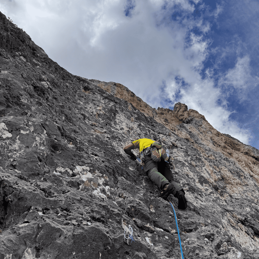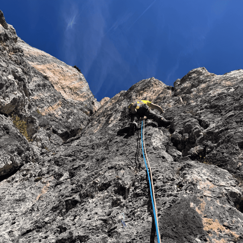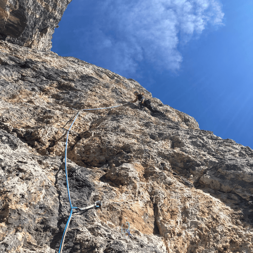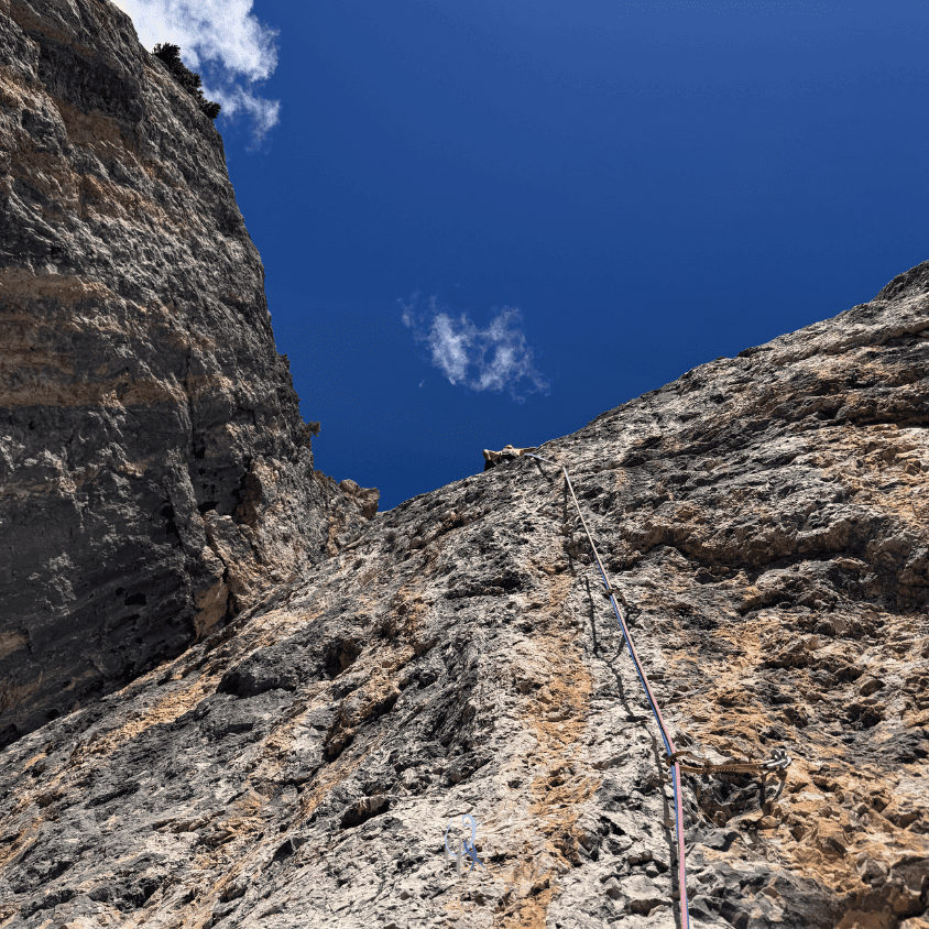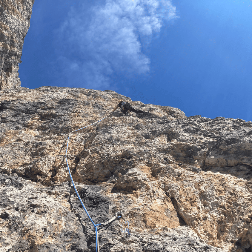 Eh sì, più salgo e più penso che ascoltare il suggerimento è stata la mossa giusta. I gradi e l’obbligatorio mi facevano paura, ma la linea, la roccia e la scalata ne valgono la pena.