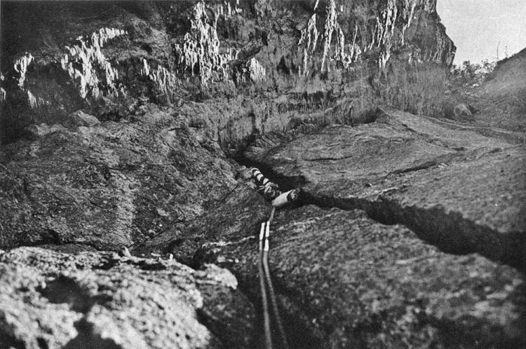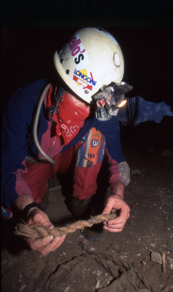 Con due tiri già attrezzati, la mattina loro sono partiti prestissimo, risalendo le corde fisse. Io e Antonio eravamo dietro e alla fine li abbiamo raggiunti sotto il tetto, quello che oggi è il tiro della Tromba.
